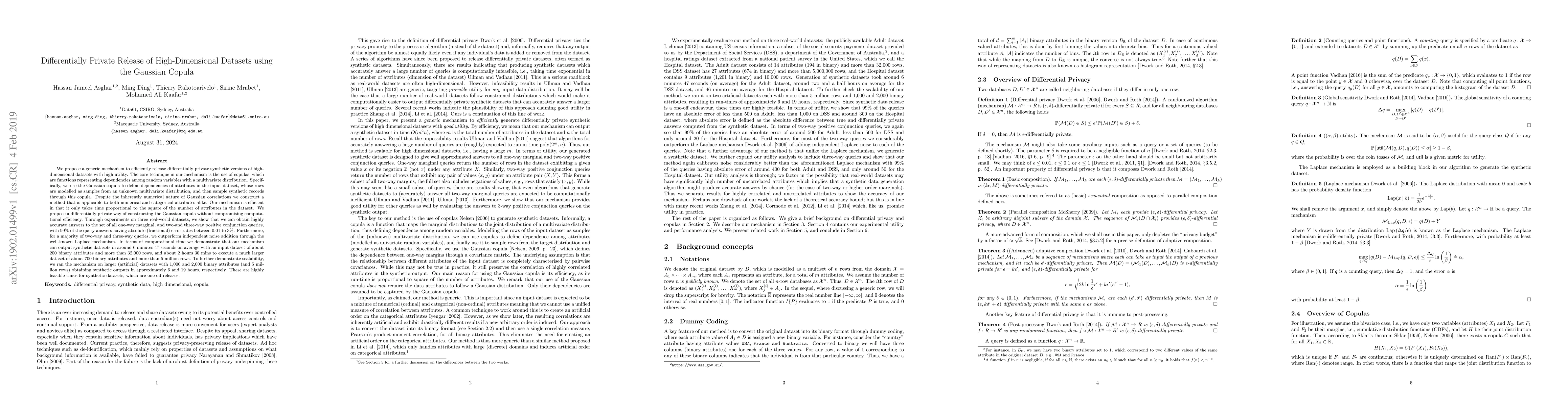 This paper proposes a differentially private mechanism using Gaussian copulas to efficiently generate synthetic high-dimensional datasets with high utility. The method is scalable and outperforms traditional noise addition for most queries, achieving accurate results in a reasonable time frame.