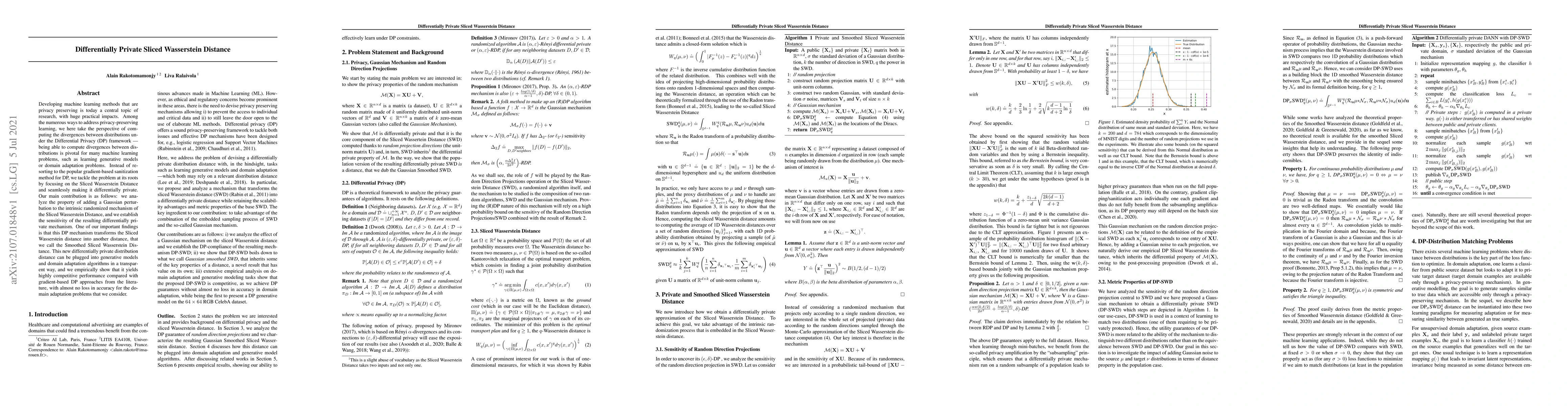 This paper proposes a differentially private version of the Sliced Wasserstein Distance, which is used for comparing distributions in privacy-preserving machine learning. By adding Gaussian noise to the Sliced Wasserstein Distance, the authors create a new distance measure, the Smoothed Sliced Wasserstein Distance, which maintains competitive performance for generative models and domain adaptation while ensuring privacy.