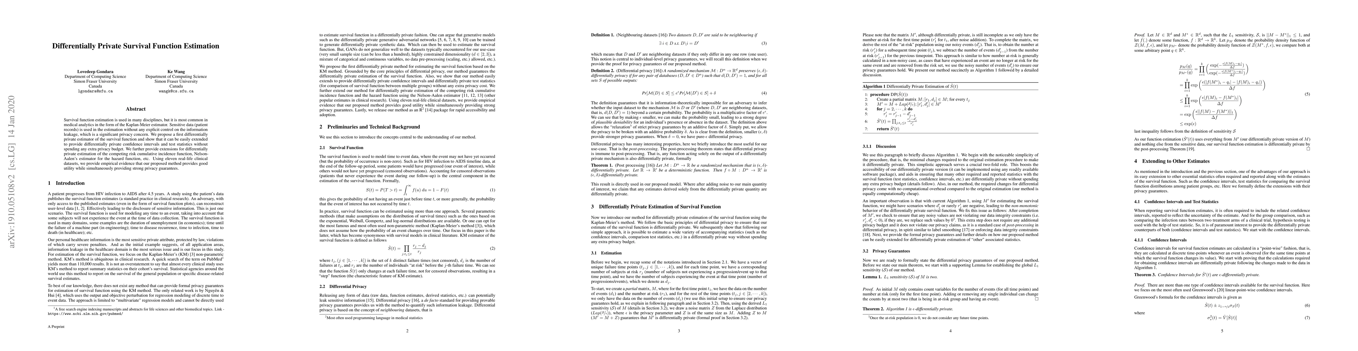 The paper proposes a differentially private estimator for survival function estimation, applicable to medical analytics, and demonstrates its extension to competing risk and hazard function estimations. Empirical results from eleven clinical datasets show effective utility alongside robust privacy protection.