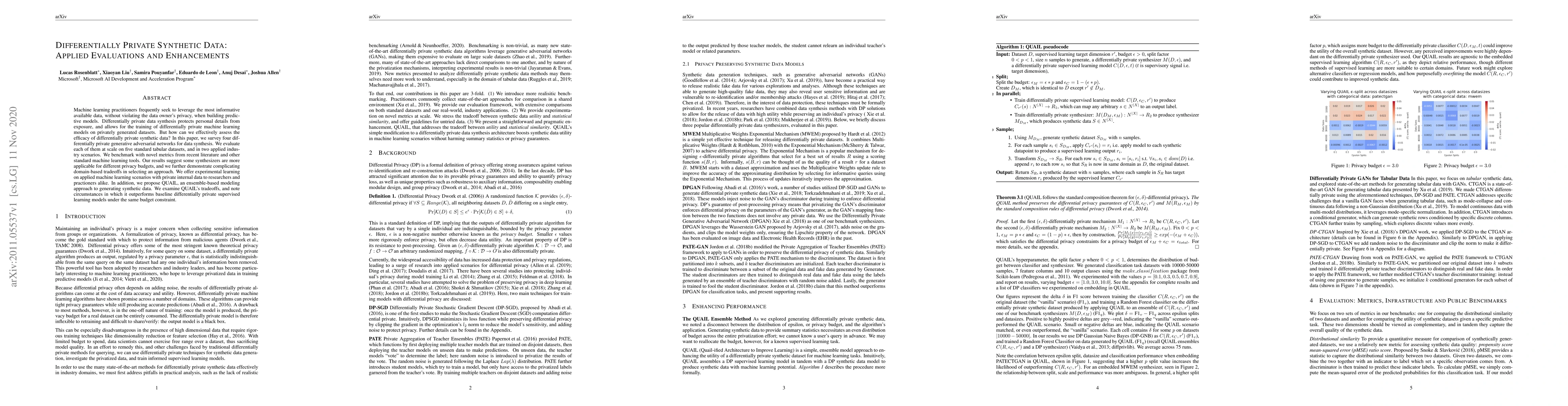 Machine learning practitioners frequently seek to leverage the most informative available data, without violating the data owner's privacy, when building predictive models. Differentially private data synthesis protects personal details from exposure, and allows for the training of differentially private machine learning models on privately generated datasets. But how can we effectively assess the efficacy of differentially private synthetic data? In this paper, we survey four differentially private generative adversarial networks for data synthesis. We evaluate each of them at scale on five standard tabular datasets, and in two applied industry scenarios. We benchmark with novel metrics from recent literature and other standard machine learning tools. Our results suggest some synthesizers are more applicable for different privacy budgets, and we further demonstrate complicating domain-based tradeoffs in selecting an approach. We offer experimental learning on applied machine learning scenarios with private internal data to researchers and practioners alike. In addition, we propose QUAIL, an ensemble-based modeling approach to generating synthetic data. We examine QUAIL's tradeoffs, and note circumstances in which it outperforms baseline differentially private supervised learning models under the same budget constraint.