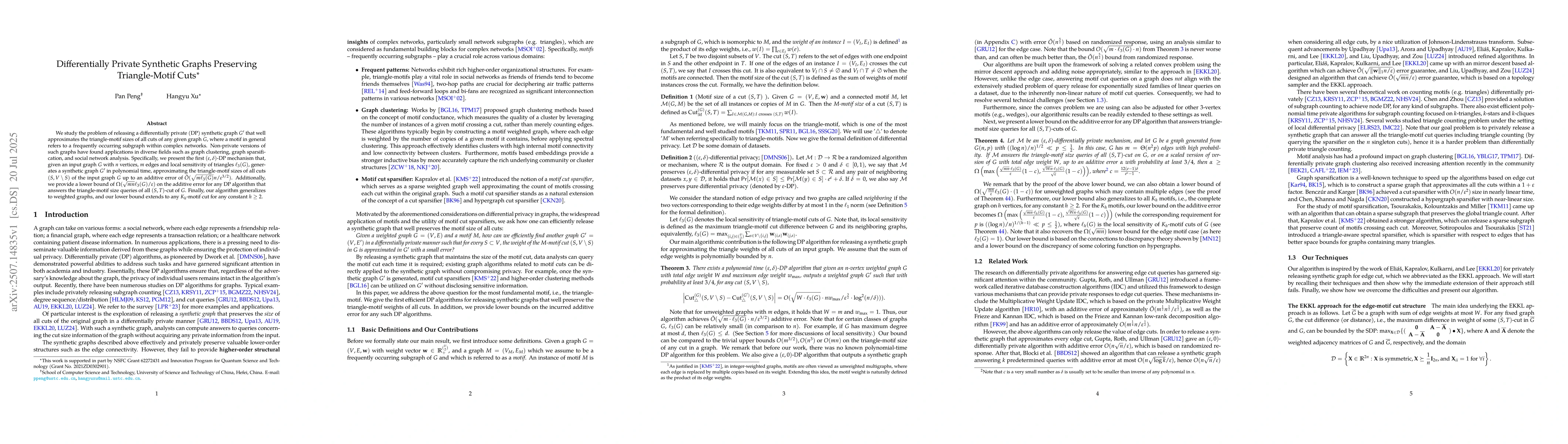 We study the problem of releasing a differentially private (DP) synthetic graph $G'$ that well approximates the triangle-motif sizes of all cuts of any given graph $G$, where a motif in general refers to a frequently occurring subgraph within complex networks. Non-private versions of such graphs have found applications in diverse fields such as graph clustering, graph sparsification, and social network analysis. Specifically, we present the first $(\varepsilon,\delta)$-DP mechanism that, given an input graph $G$ with $n$ vertices, $m$ edges and local sensitivity of triangles $\ell_{3}(G)$, generates a synthetic graph $G'$ in polynomial time, approximating the triangle-motif sizes of all cuts $(S,V\setminus S)$ of the input graph $G$ up to an additive error of $\tilde{O}(\sqrt{m\ell_{3}(G)}n/\varepsilon^{3/2})$. Additionally, we provide a lower bound of $\Omega(\sqrt{mn}\ell_{3}(G)/\varepsilon)$ on the additive error for any DP algorithm that answers the triangle-motif size queries of all $(S,T)$-cut of $G$. Finally, our algorithm generalizes to weighted graphs, and our lower bound extends to any $K_h$-motif cut for any constant $h\geq 2$.