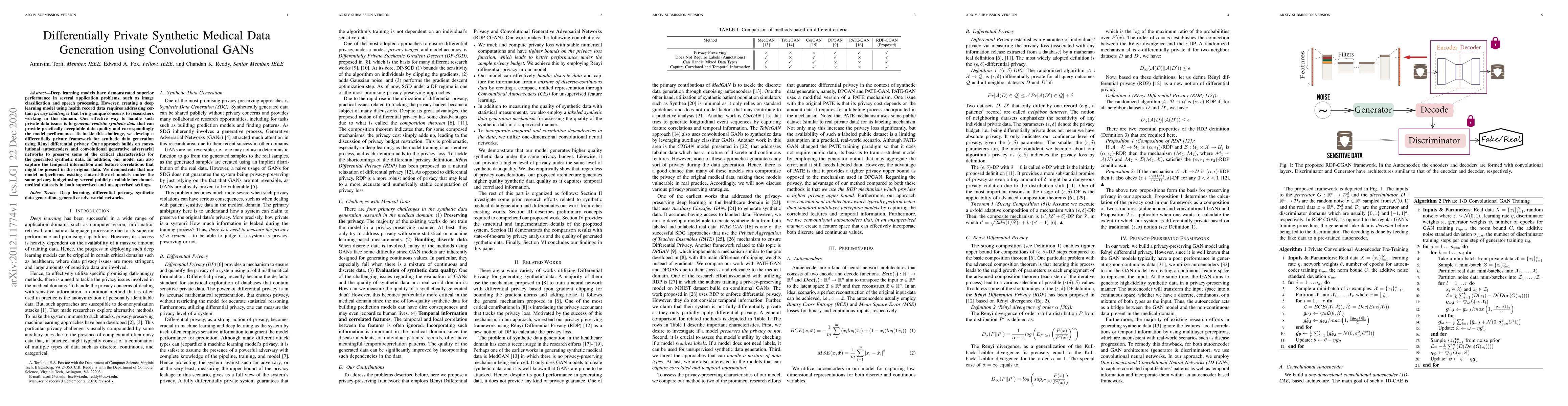 This paper proposes a differentially private framework using convolutional GANs for generating synthetic medical data that preserves patient privacy. The model outperforms existing methods in maintaining data quality and model performance across various medical datasets.