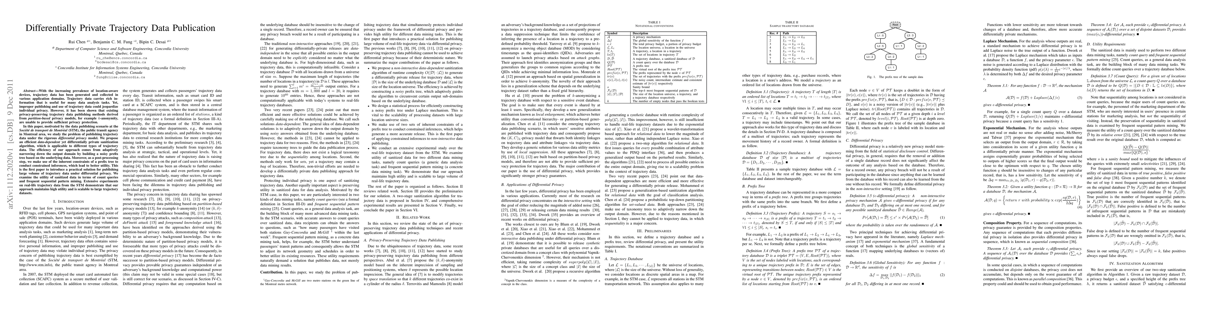 This paper proposes an efficient differentially private sanitization algorithm for publishing trajectory data, addressing privacy concerns while maintaining high utility. The method uses a noisy prefix tree to adaptively narrow the output domain, achieving scalability and high utility for count queries and pattern mining, as demonstrated through experiments on real-life transit data from Montreal.