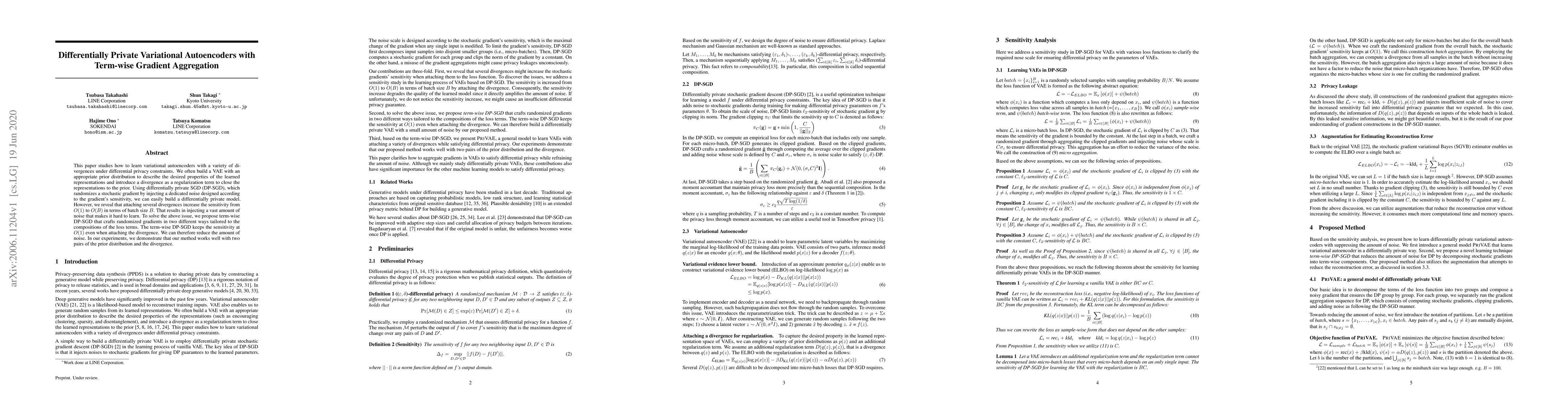 This paper proposes a differentially private variational autoencoder (VAE) using term-wise gradient aggregation to maintain sensitivity at O(1) while attaching multiple divergences. The method reduces noise and improves learning compared to traditional DP-SGD.