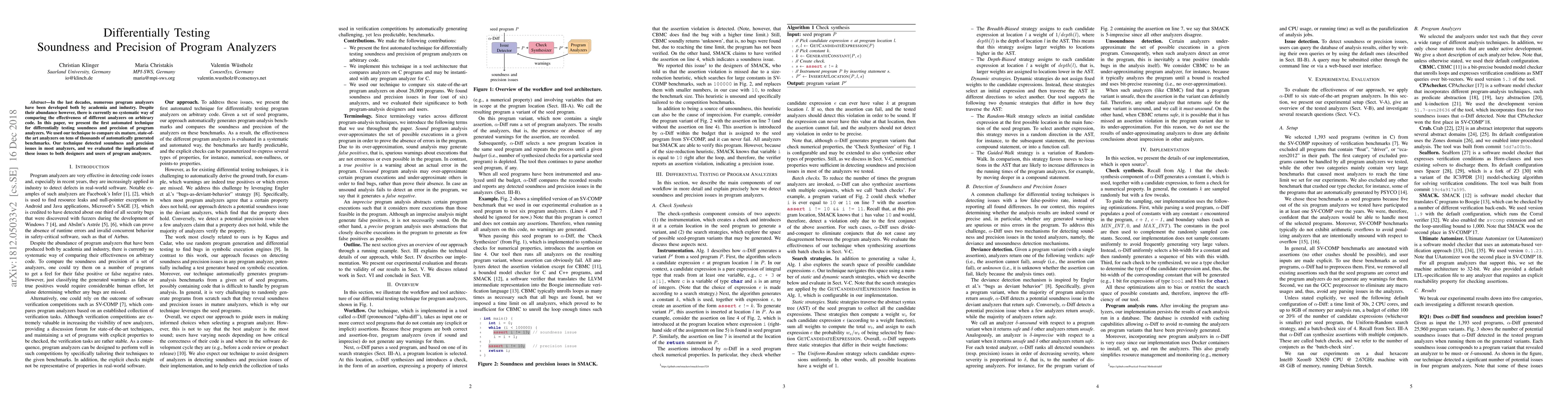 The research presents a differentially testing technique for automatically comparing the soundness and precision of program analyzers using six mature, state-of-the-art analyzers and tens of thousands of automatically generated benchmarks.