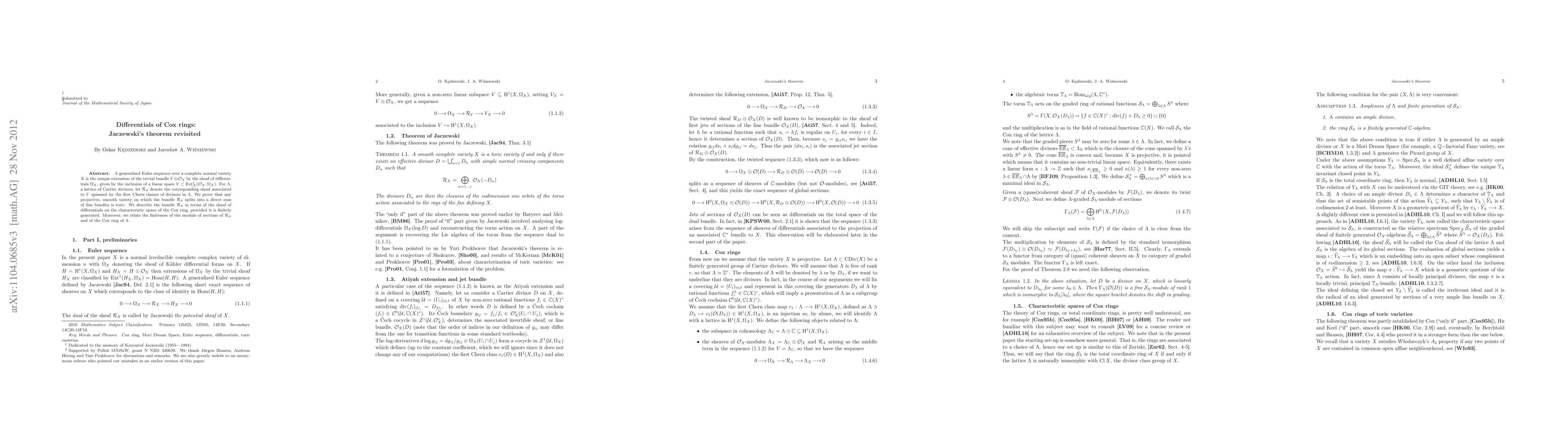 A generalized Euler sequence over a complete normal variety X is the unique extension of the trivial bundle V \otimes O_X by the sheaf of differentials \Omega_X, given by the inclusion of a linear space V in Ext^1(O_X,\Omega_X). For \Lambda, a lattice of Cartier divisors, let R_\Lambda denote the corresponding sheaf associated to V spanned by the first Chern classes of divisors in \Lambda. We prove that any projective, smooth variety on which the bundle R_\Lambda splits into a direct sum of line bundles is toric. We describe the bundle R_\Lambda in terms of the sheaf of differentials on the characteristic space of the Cox ring, provided it is finitely generated. Moreover, we relate the finiteness of the module of sections of R_\Lambda and of the Cox ring of \Lambda.