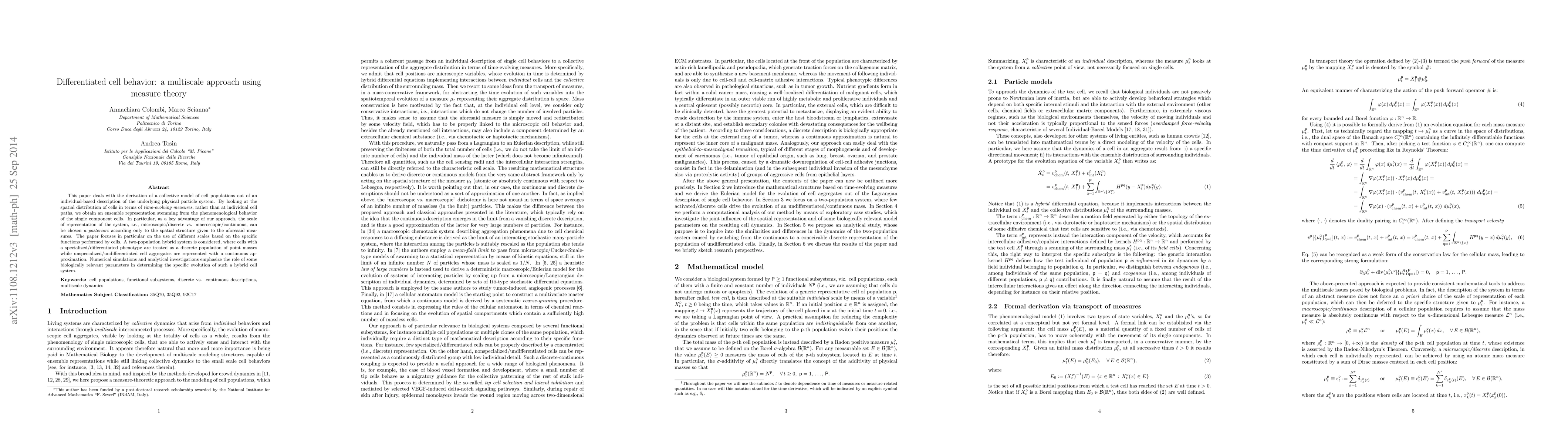 This paper deals with the derivation of a collective model of cell populations out of an individual-based description of the underlying physical particle system. By looking at the spatial distribution of cells in terms of time-evolving measures, rather than at individual cell paths, we obtain an ensemble representation stemming from the phenomenological behavior of the single component cells. In particular, as a key advantage of our approach, the scale of representation of the system, i.e., microscopic/discrete vs. macroscopic/continuous, can be chosen a posteriori according only to the spatial structure given to the aforesaid measures. The paper focuses in particular on the use of different scales based on the specific functions performed by cells. A two-population hybrid system is considered, where cells with a specialized/differentiated phenotype are treated as a discrete population of point masses while unspecialized/undifferentiated cell aggregates are represented with a continuous approximation. Numerical simulations and analytical investigations emphasize the role of some biologically relevant parameters in determining the specific evolution of such a hybrid cell system.