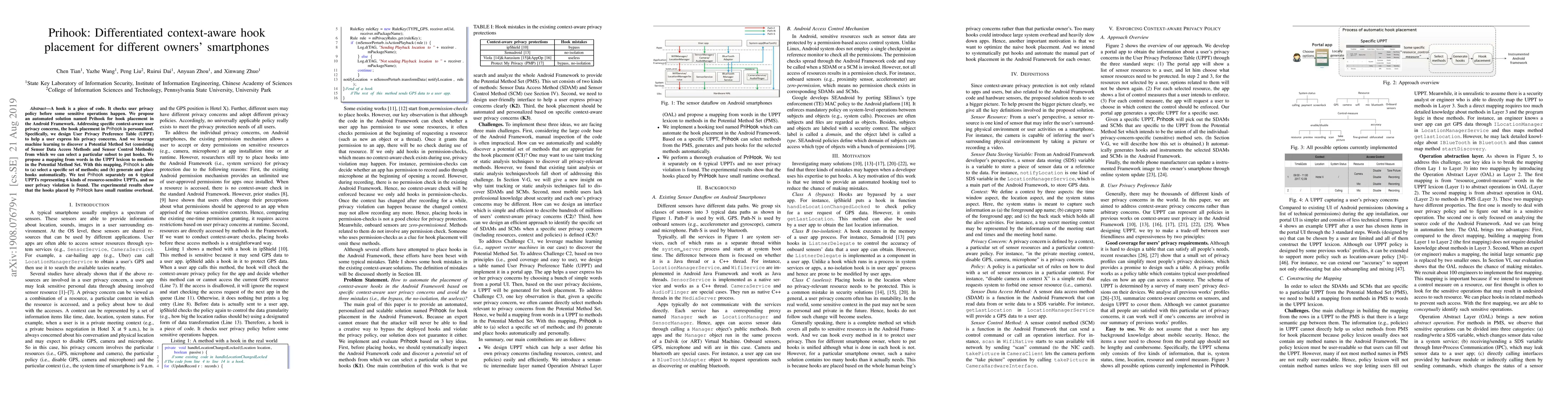 A hook is a piece of code. It checks user privacy policy before some sensitive operations happen. We propose an automated solution named Prihook for hook placement in the Android Framework. Addressing specific context-aware user privacy concerns, the hook placement in Prihook is personalized. Specifically, we design User Privacy Preference Table (UPPT) to help a user express his privacy concerns. And we leverage machine learning to discover a Potential Method Set (consisting of Sensor Data Access Methods and Sensor Control Methods) from which we can select a particular subset to put hooks. We propose a mapping from words in the UPPT lexicon to methods in the Potential Method Set. With this mapping, Prihook is able to (a) select a specific set of methods; and (b) generate and place hooks automatically. We test Prihook separately on 6 typical UPPTs representing 6 kinds of resource-sensitive UPPTs, and no user privacy violation is found. The experimental results show that the hooks placed by PriHook have small runtime overhead.