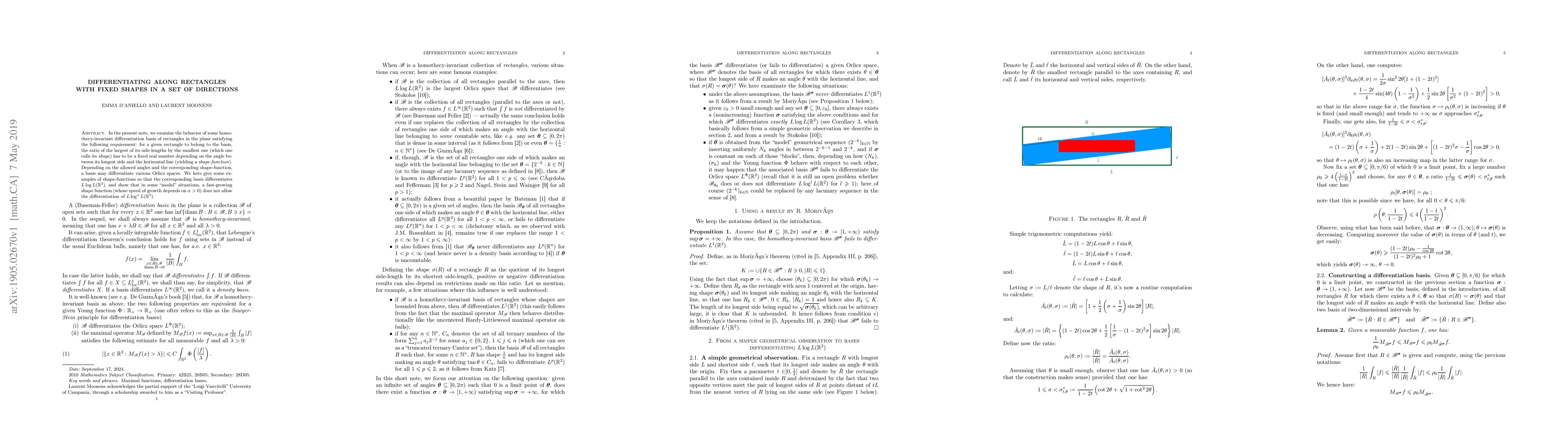 In the present note, we examine the behavior of some homo\-thecy-invariant differentiation basis of rectangles in the plane satisfying the following requirement: for a given rectangle to belong to the basis, the ratio of the largest of its side-lengths by the smallest one (which one calls its \emph{shape}) has to be a fixed real number depending on the angle between its longest side and the horizontal line (yielding a \emph{shape-function}). Depending on the allowed angles and the corresponding shape-function, a basis may differentiate various Orlicz spaces. We here give some examples of shape-functions so that the corresponding basis differentiates $L\log L(\R^2)$, and show that in some `model' situations, a fast-growing shape function (whose speed of growth depends on $\alpha>0$) does not allow the differentiation of $L\log^\alpha L(\R^2)$.
