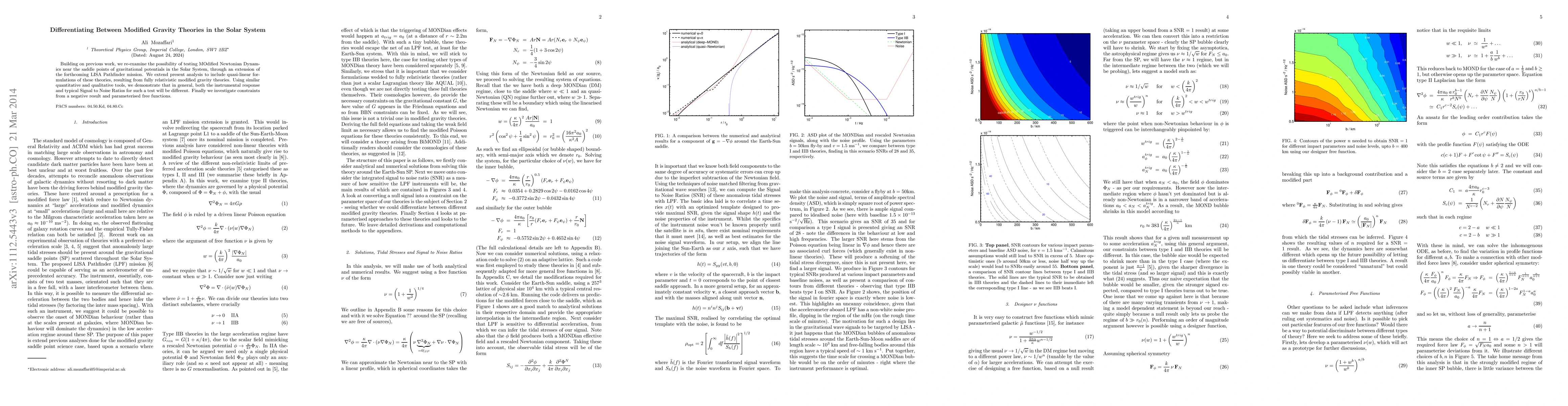 Building on previous work, we re-examine the possibility of testing MOdified Newtonian Dynamics near the saddle points of gravitational potentials in the Solar System, through an extension of the forthcoming LISA Pathfinder mission. We extend present analysis to include quasi-linear formulations of these theories, resulting from fully relativistic modified gravity theories. Using similar quantitative and qualitative tools, we demonstrate that in general, both the instrumental response and typical Signal to Noise Ratios for such a test will be different. Finally we investigate constraints from a negative result and parameterised free functions.