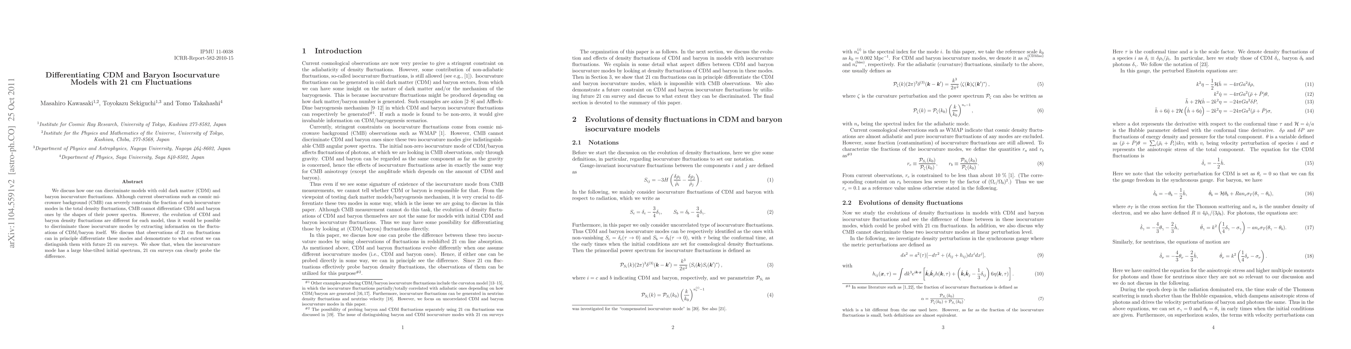 This paper explores how 21 cm fluctuations can distinguish between cold dark matter (CDM) and baryon isocurvature models, noting that while CMB observations can constrain isocurvature modes, they cannot differentiate CDM and baryon modes. Future 21 cm surveys may reveal differences in the evolution of CDM and baryon density fluctuations, thus offering a means to differentiate these models.