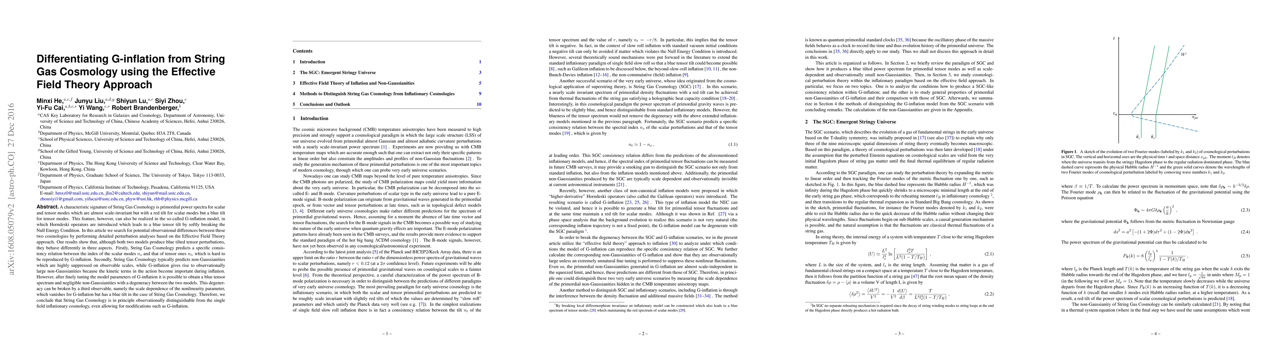 This paper differentiates String Gas Cosmology from G-inflation using the Effective Field Theory approach, finding that while both predict blue tilted tensor perturbations, String Gas Cosmology uniquely predicts specific consistency relations, suppressed non-Gaussianities, and a blue tilt in the nonlinearity parameter, distinguishing it from G-inflation even with parameter tuning.