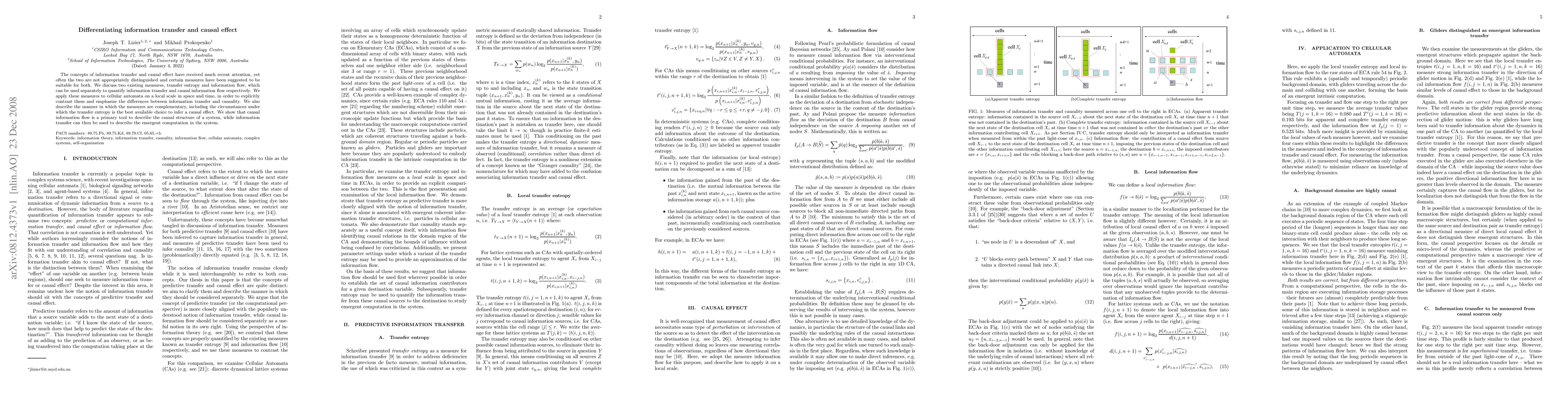 This paper distinguishes between information transfer and causal effect, applying transfer entropy and information flow measures to cellular automata to highlight their differences. It concludes that causal information flow is essential for understanding causal structures, while information transfer aids in describing emergent computation.