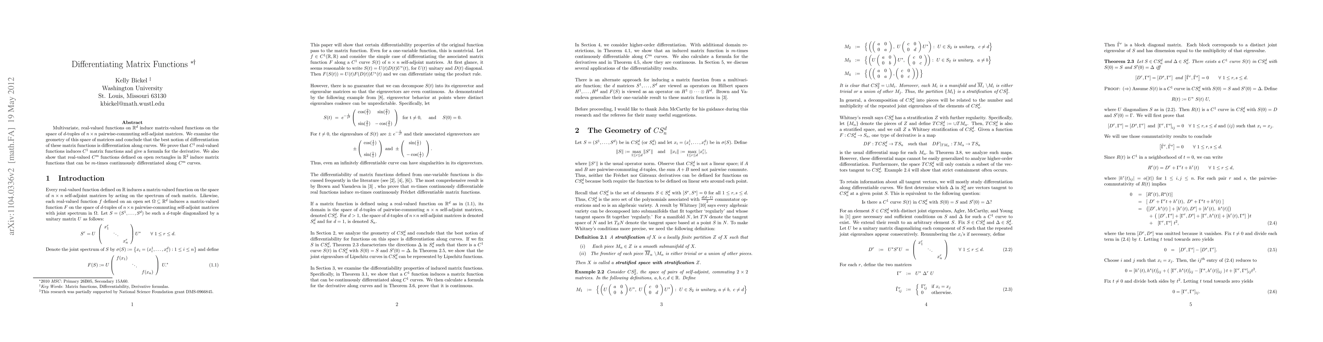 Multivariable, real-valued functions induce matrix-valued functions defined on the space of d-tuples of n-times-n pairwise-commuting self-adjoint matrices. We examine the geometry of this space of matrices and conclude that the best notion of differentiation of these matrix-valued functions is differentiation along curves. We prove that a C^1 real-valued function always induces a C^1 matrix function and give an explicit formula for the derivative. We also show that every real-valued C^m function defined on an open rectangle in the plane induces a matrix-valued function that can be m-times continuously differentiated along C^m curves.