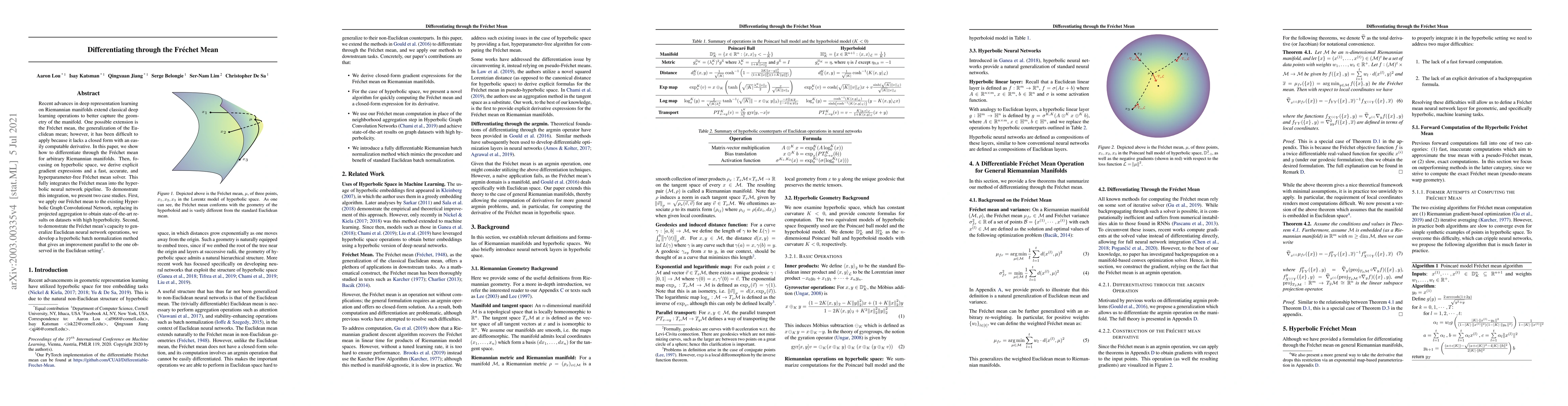 This paper presents a method for differentiating through the Fr\'echet mean on Riemannian manifolds, specifically deriving explicit gradient expressions for hyperbolic space. It introduces a fast and hyperparameter-free Fr\'echet mean solver, demonstrating its application in hyperbolic neural networks, including improved performance in hyperbolic graph convolutional networks and a new hyperbolic batch normalization method.