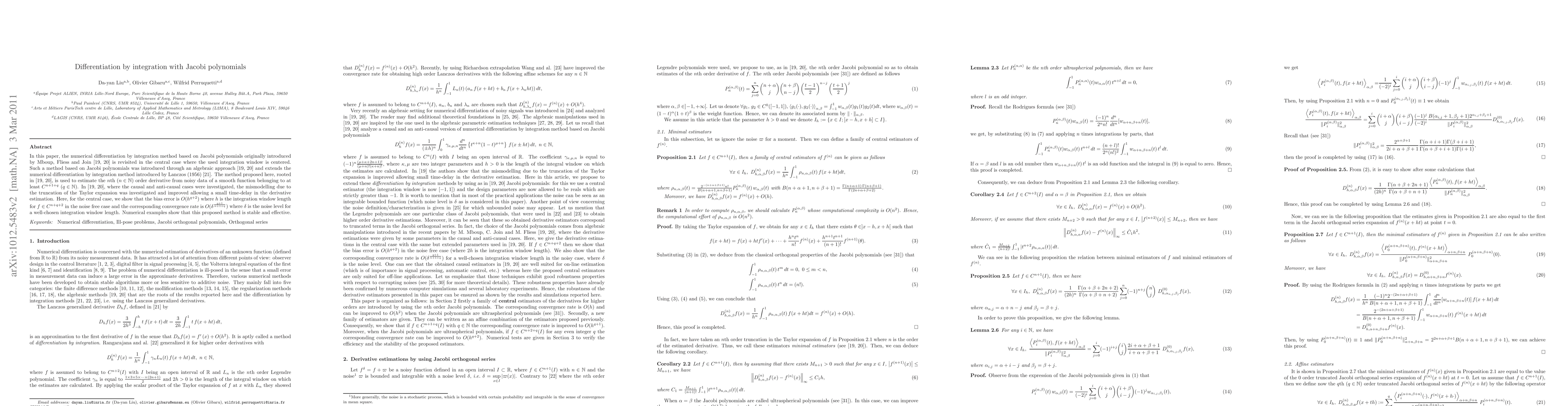 In this paper, the numerical differentiation by integration method based on Jacobi polynomials originally introduced by Mboup, Fliess and Join is revisited in the central case where the used integration window is centered. Such method based on Jacobi polynomials was introduced through an algebraic approach and extends the numerical differentiation by integration method introduced by Lanczos. The here proposed method is used to estimate the $n^{th}$ ($n \in \mathbb{N}$) order derivative from noisy data of a smooth function belonging to at least $C^{n+1+q}$ $(q \in \mathbb{N})$. In the recent paper of Mboup, Fliess and Join, where the causal and anti-causal case were investigated, the mismodelling due to the truncation of the Taylor expansion was investigated and improved allowing a small time-delay in the derivative estimation. Here, for the central case, we show that the bias error is $O(h^{q+2})$ where $h$ is the integration window length for $f\in C^{n+q+2}$ in the noise free case and the corresponding convergence rate is $O(\delta^{\frac{q+1}{n+1+q}})$ where $\delta$ is the noise level for a well chosen integration window length. Numerical examples show that this proposed method is stable and effective.