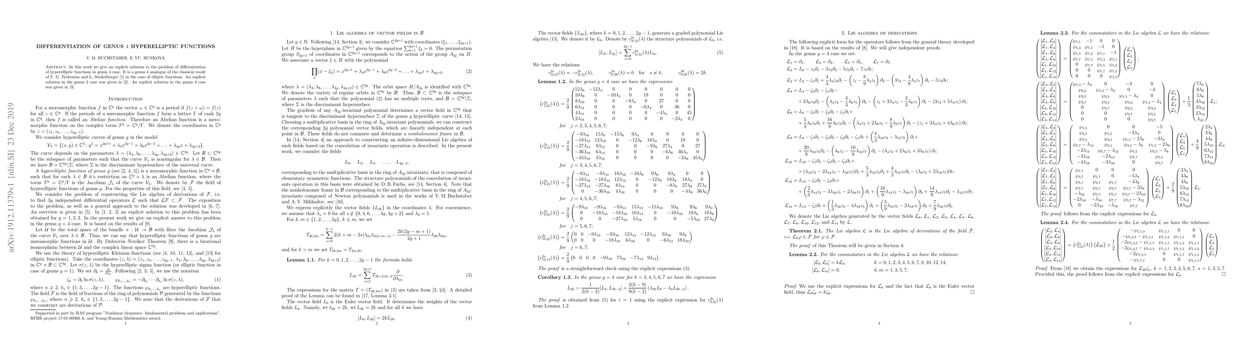 In this work we give an explicit solution to the problem of differentiation of hyperelliptic functions in genus $4$ case. It is a genus $4$ analogue of the classical result of F. G. Frobenius and L. Stickelberger [F. G. Frobenius, L. Stickelberger, "Uber die Differentiation der elliptischen Functionen nach den Perioden und Invarianten", J. Reine Angew. Math., 92 (1882), 311-337] in the case of elliptic functions. An explicit solution in the genus $2$ case was given in [V. M. Buchstaber, "Polynomial dynamical systems and Korteweg-de Vries equation", Proc. Steklov Inst. Math., 294 (2016), 176-200]. An explicit solution in the genus $3$ case was given in [E. Yu. Bunkova, "Differentiation of genus 3 hyperelliptic functions", European Journal of Mathematics, 4:1 (2018), 93-112].
