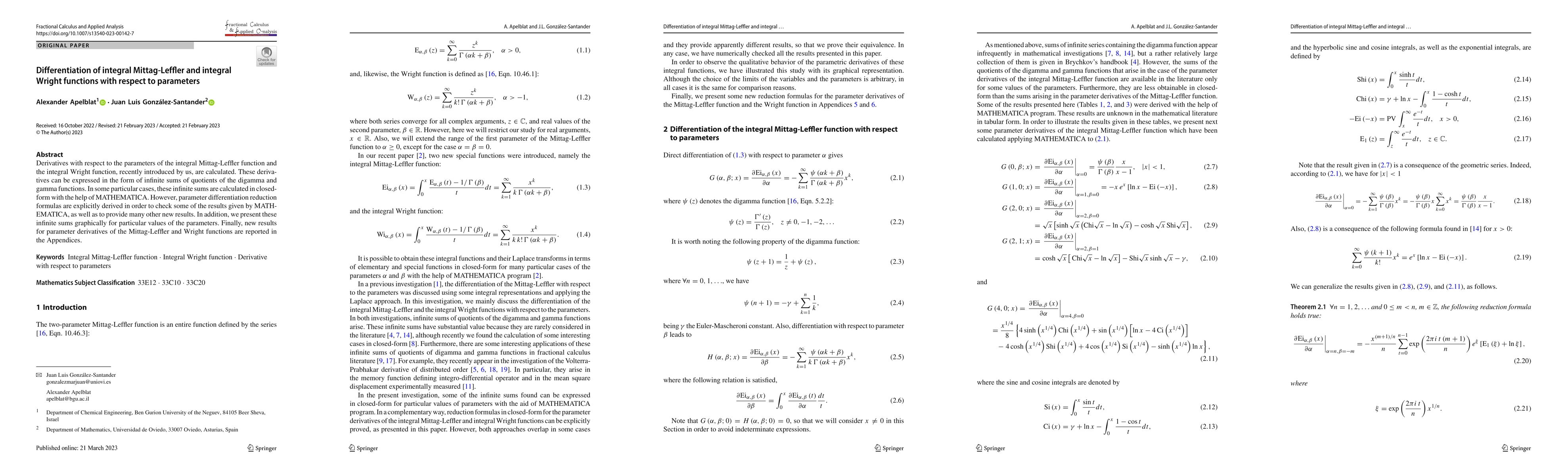 This paper calculates derivatives of integral Mittag-Leffler and Wright functions with respect to their parameters, expressing them as infinite sums involving digamma and gamma functions. It also derives reduction formulas and presents graphical representations for specific parameter values.