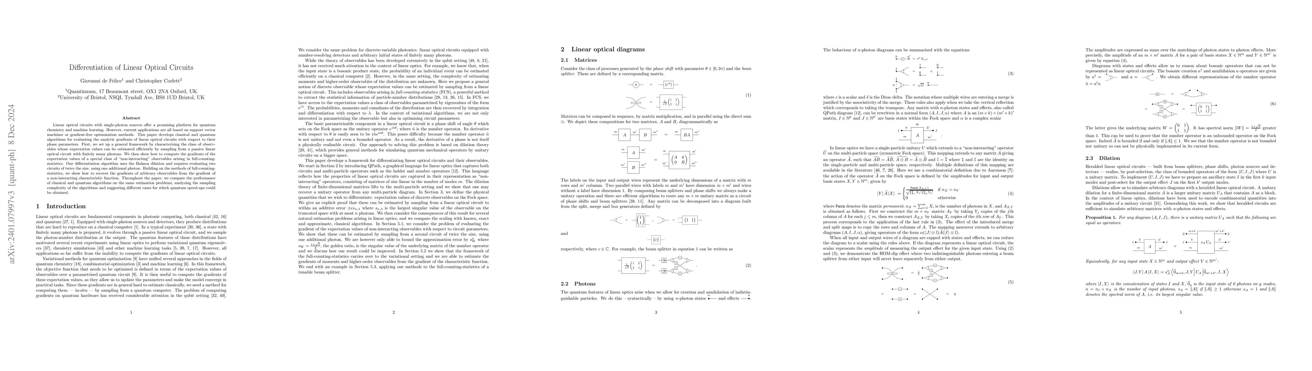 Experimental setups based on linear optical circuits and single photon sources offer a promising platform for near-term quantum machine learning. However, current applications are all based on support vector machines and gradient-free optimization methods. Differentiating an optical circuit over a phase parameter poses difficulty because it results in an operator on the Fock space which is not unitary. In this paper, we show that the derivative of the expectation values of a linear optical circuit can be computed by sampling from a larger circuit, using one additional photon. In order to express the derivative in terms of expectation values, we develop a circuit extraction procedure based on unitary dilation. We end by showing that the full gradient of a universal programmable interferometer can be estimated using polynomially many queries to a boson sampling device. This is in contrast to the qubit setting, where exponentially many parameters are needed to cover the space of unitaries. Our algorithm enables applications of photonic technologies to machine learning, quantum chemistry and optimization, powered by gradient descent.