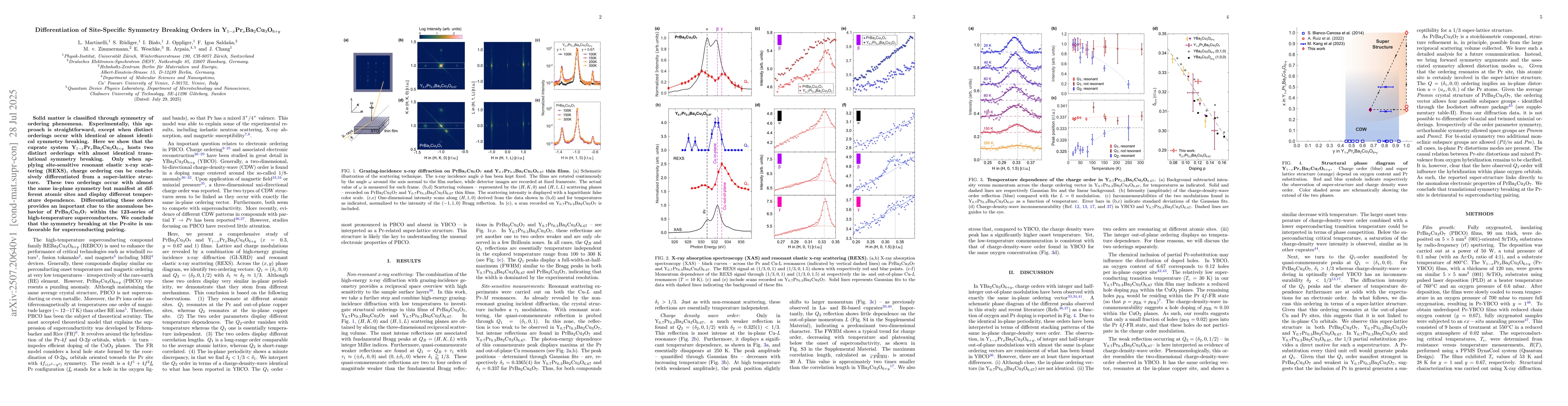 Solid matter is classified through symmetry of ordering phenomena. Experimentally, this approach is straightforward, except when distinct orderings occur with identical or almost identical symmetry breaking. Here we show that the cuprate system Y$_{1-x}$Pr$_x$Ba$_2$Cu$_3$O$_{6+y}$ hosts two distinct orderings with almost identical translational symmetry breaking. Only when applying site-sensitive resonant elastic x-ray scattering (REXS), charge ordering can be conclusively differentiated from a super-lattice structure. These two orderings occur with almost the same in-plane symmetry but manifest at different atomic sites and display different temperature dependence. Differentiating these orders provides an important clue to the anomalous behavior of PrBa$_2$Cu$_3$O$_7$ within the 123-series of high-temperature superconductors. We conclude that the symmetry breaking at the Pr-site is unfavorable for superconducting pairing.