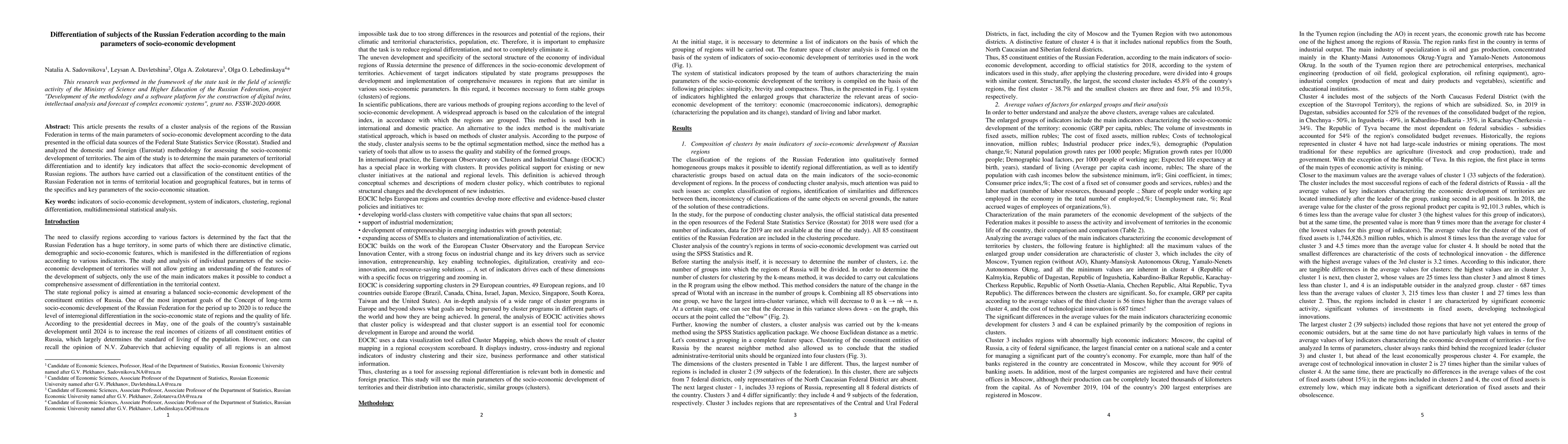 This paper conducts a cluster analysis of Russian Federation regions based on socio-economic development parameters, identifying key indicators and classifying regions by their socio-economic specifics rather than geographical features. The study aims to reveal territorial differentiation and influential socio-economic factors.