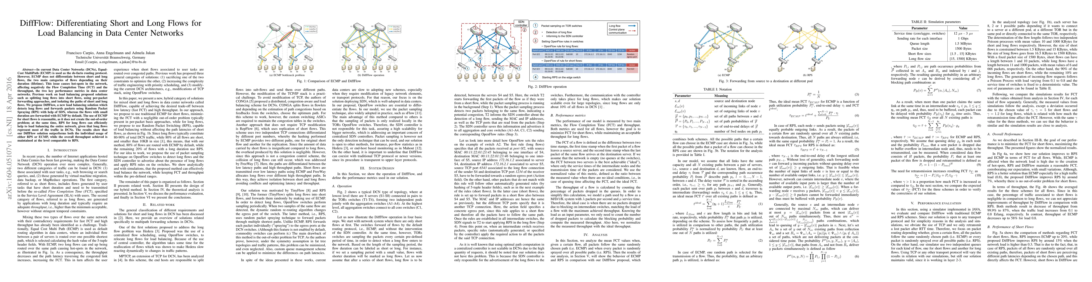 DiffFlow proposes a new load balancing method for Data Center Networks that differentiates between short and long flows, using ECMP for short flows and Random Packet Spraying with SDN for long flows to mitigate hot-spots and improve throughput and Flow Completion Time. The results show DiffFlow outperforms both ECMP and RPS alone while maintaining comparable throughput.