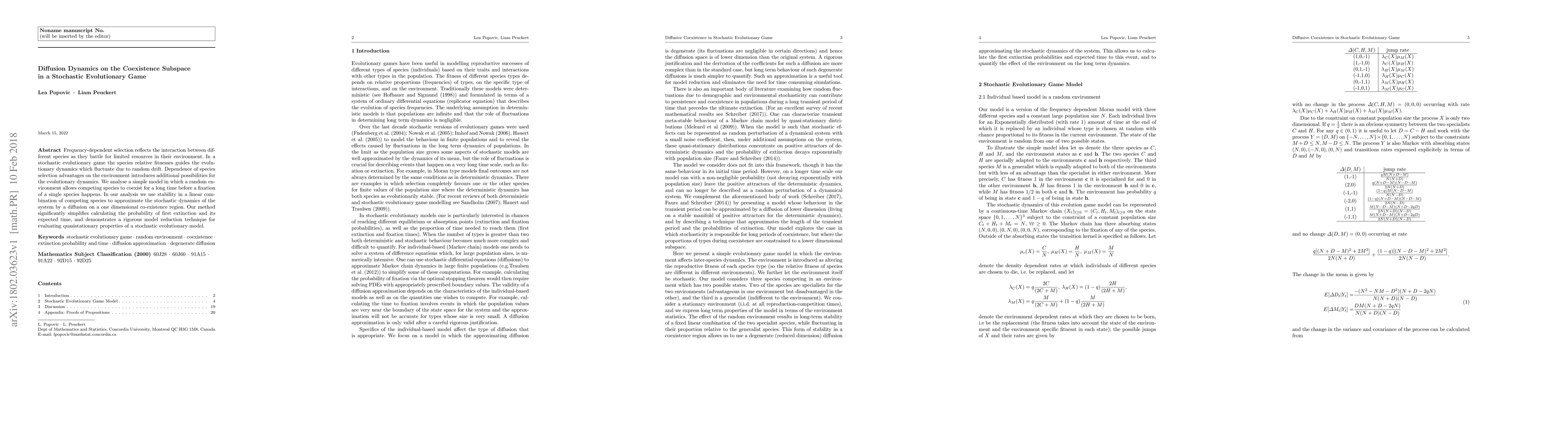 The paper introduces a novel approach for approximating stochastic evolutionary dynamics using diffusion processes on the coexistence subspace, simplifying the calculation of extinction probabilities and expected times.