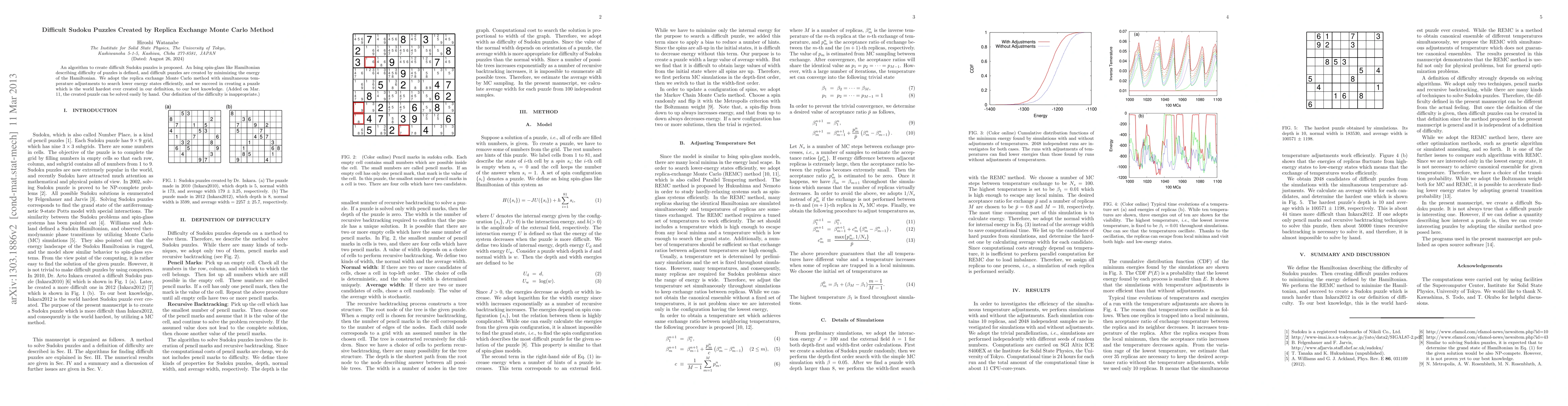 Researchers developed an algorithm to create extremely difficult Sudoku puzzles using a replica exchange Monte Carlo method, successfully creating the world's hardest puzzle, but later found it could be solved easily by hand due to flaws in their difficulty definition.