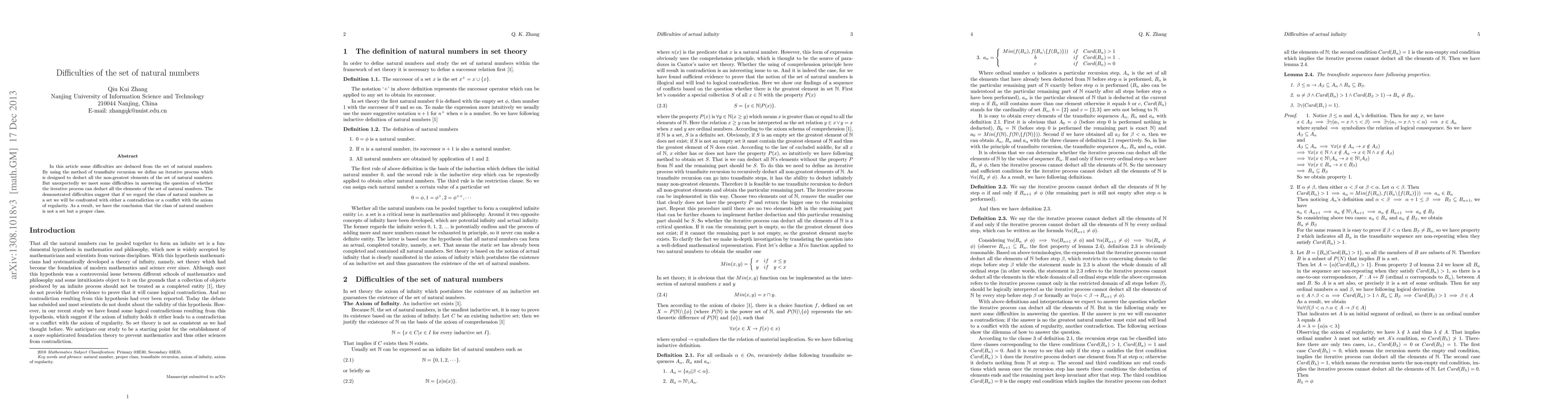 In this article some difficulties are deduced from the set of natural numbers. By using the method of transfinite recursion we define an iterative process which is designed to deduct all the non-greatest elements of the set of natural numbers. But unexpectedly we meet some difficulties in answering the question of whether the iterative process can deduct all the elements of the set of natural numbers. The demonstrated difficulties suggest that if we regard the class of natural numbers as a set we will be confronted with either a contradiction or a conflict with the axiom of regularity. As a result, we have the conclusion that the class of natural numbers is not a set but a proper class.