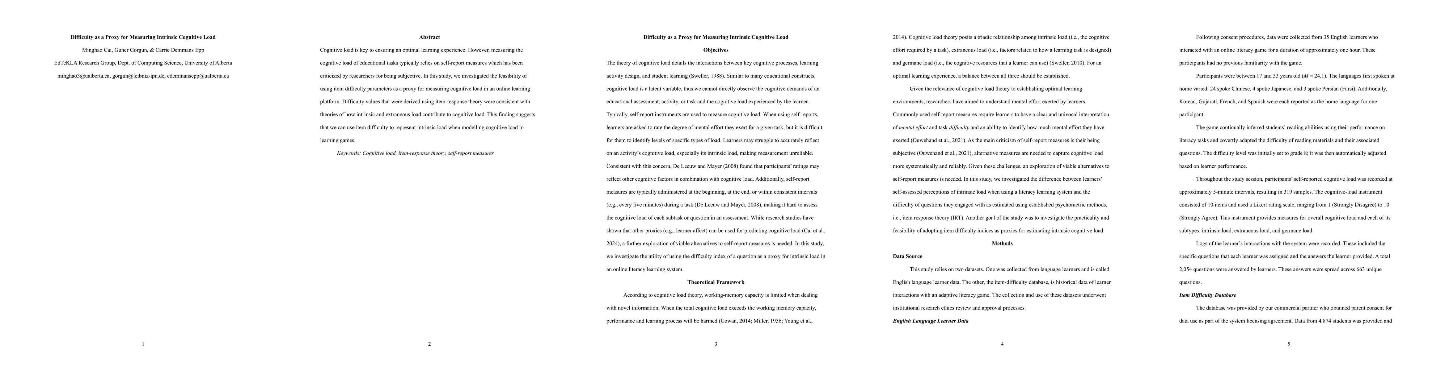 Cognitive load is key to ensuring an optimal learning experience. However, measuring the cognitive load of educational tasks typically relies on self-report measures which has been criticized by researchers for being subjective. In this study, we investigated the feasibility of using item difficulty parameters as a proxy for measuring cognitive load in an online learning platform. Difficulty values that were derived using item-response theory were consistent with theories of how intrinsic and extraneous load contribute to cognitive load. This finding suggests that we can use item difficulty to represent intrinsic load when modelling cognitive load in learning games.