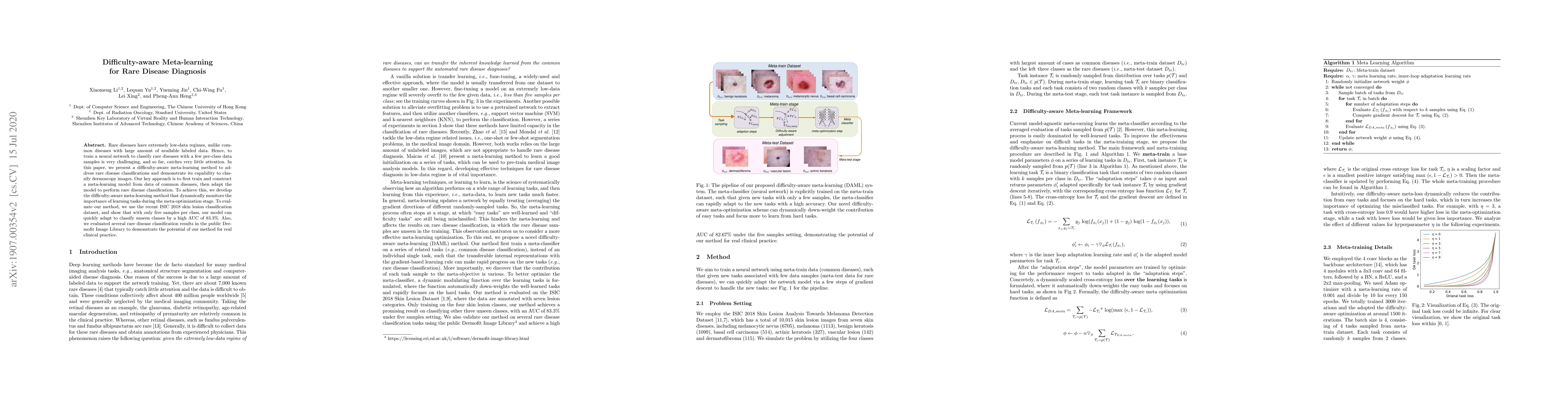 This paper presents a difficulty-aware meta-learning method for classifying rare diseases with limited data, training a meta-learning model from common diseases and adapting it for rare disease classification. The method achieves a high AUC of 83.3% with only five samples per class, demonstrating its potential for real clinical practice.