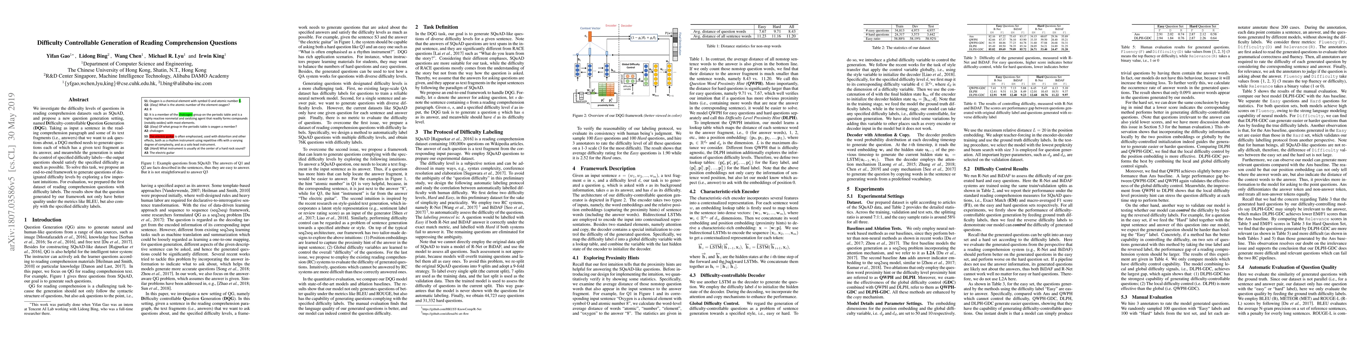 This paper proposes a framework for generating reading comprehension questions of controllable difficulty levels, named Difficulty-controllable Question Generation (DQG). The framework generates questions that match specified difficulty labels while maintaining high-quality output, validated through a newly created dataset and evaluation metrics like BLEU.