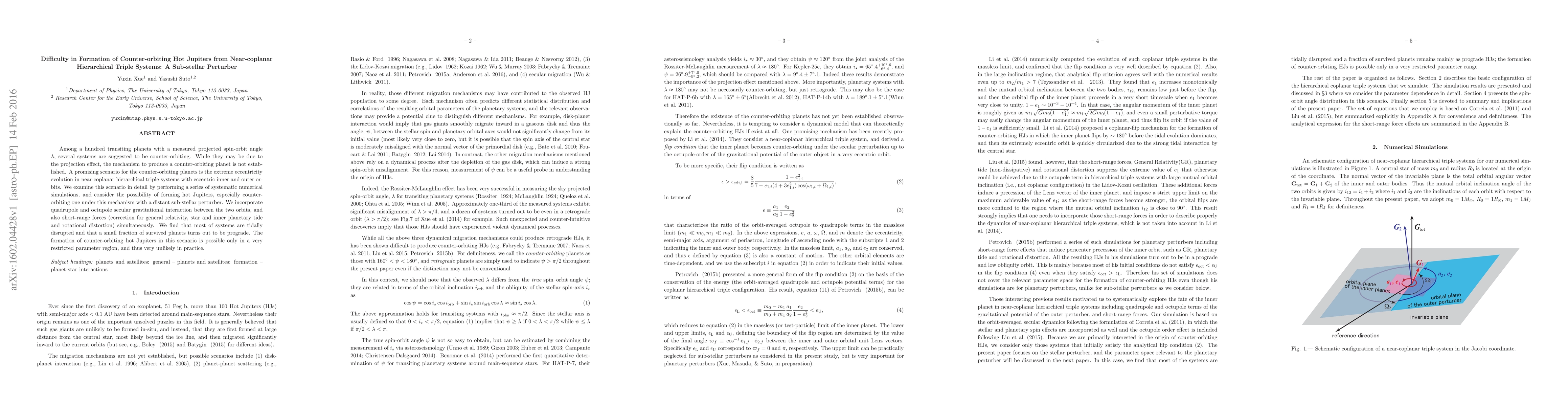 Among a hundred transiting planets with a measured projected spin-orbit angle {\lambda}, several systems are suggested to be counter-orbiting. While they may be due to the projection effect, the mechanism to produce a counter-orbiting planet is not established. A promising scenario for the counter-orbiting planets is the extreme eccentricity evolution in near-coplanar hierarchical triple systems with eccentric inner and outer or- bits. We examine this scenario in detail by performing a series of systematic numerical simulations, and consider the possibility of forming hot Jupiters, especially counter- orbiting one under this mechanism with a distant sub-stellar perturber. We incorporate quadrupole and octupole secular gravitational interaction between the two orbits, and also short-range forces (correction for general relativity, star and inner planetary tide and rotational distortion) simultaneously. We find that most of systems are tidally disrupted and that a small fraction of survived planets turns out to be prograde. The formation of counter-orbiting hot Jupiters in this scenario is possible only in a very restricted parameter region, and thus very unlikely in practice.
