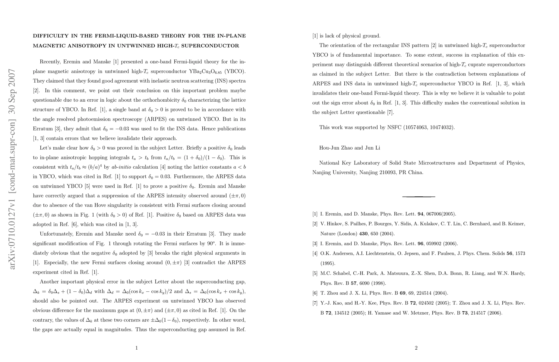 Recently, Eremin and Manske [1] presented a oneband Fermi-liquid theory for the in-plane magnetic anisotropy in untwinned high-Tc superconductor YBa2Cu3O6:85 (YBCO). They claimed that they found good agreement with inelastic neutron scattering (INS) spectra. In this Comment, we point out that their conclusion on this important problem may be questionable due to an error in logic about the orthorhombicity delta_0 characterizing the lattice structure of YBCO. In Ref. [1], a single band at delta_0>0 is proved to be in accordance with the angle resolved photoemission spectroscopy (ARPES) on untwinned YBCO. But in their Erratum in PRL[3], they admit that delta_0= -0.03 was used to fit the INS data. Hence publications [1,3] contain errors that we believe invalidate their approach.