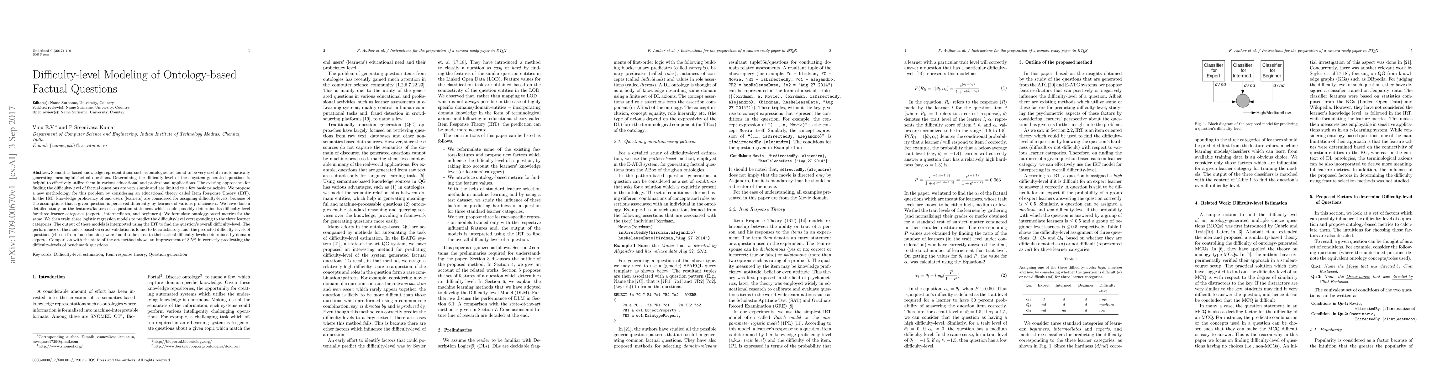 This paper proposes a new methodology for modeling the difficulty level of ontology-based factual questions using Item Response Theory (IRT), considering learners' knowledge proficiency. It formulates ontology-based metrics and trains logistic regression models to predict difficulty levels for experts, intermediates, and beginners.