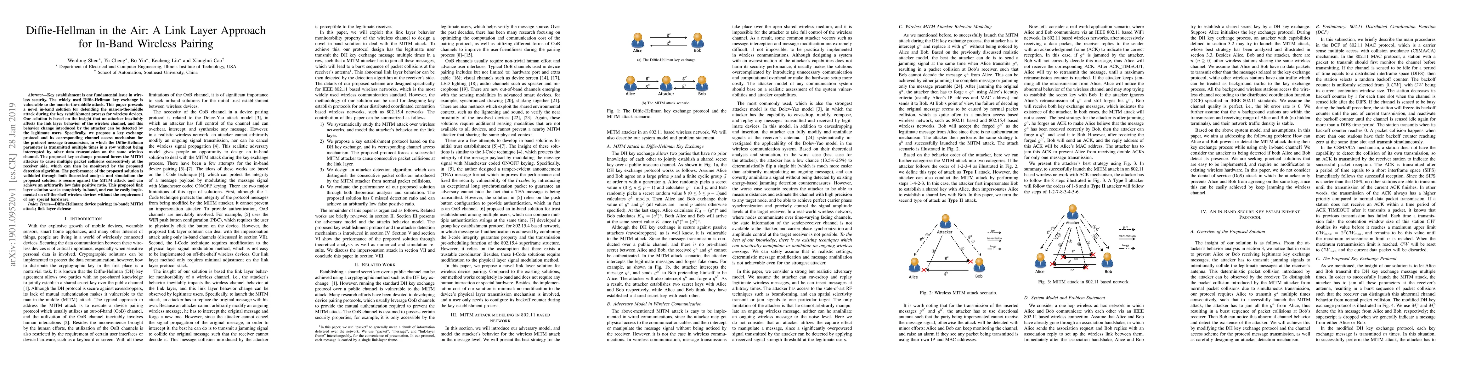 Key establishment is one fundamental issue in wireless security. The widely used Diffie-Hellman key exchange is vulnerable to the man-in-the-middle attack. This paper presents a novel in-band solution for defending the man-in-the-middle attack during the key establishment process for wireless devices. Our solution is based on the insight that an attacker inevitably affects the link layer behavior of the wireless channel, and this behavior change introduced by the attacker can be detected by the legitimate users. Specifically, we propose a key exchange protocol and its corresponding channel access mechanism for the protocol message transmission, in which the Diffie-Hellman parameter is transmitted multiple times in a row without being interrupted by other data transmission on the same wireless channel. The proposed key exchange protocol forces the MITM attacker to cause multiple packet collisions consecutively at the receiver side, which can then be monitored by the proposed detection algorithm. The performance of the proposed solution is validated through both theoretical analysis and simulation: the proposed solution is secure against the MITM attack and can achieve an arbitrarily low false positive ratio. This proposed link layer solution works completely in-band, and can be easily implemented on off-the-shelf wireless devices without the requirement of any special hardware.