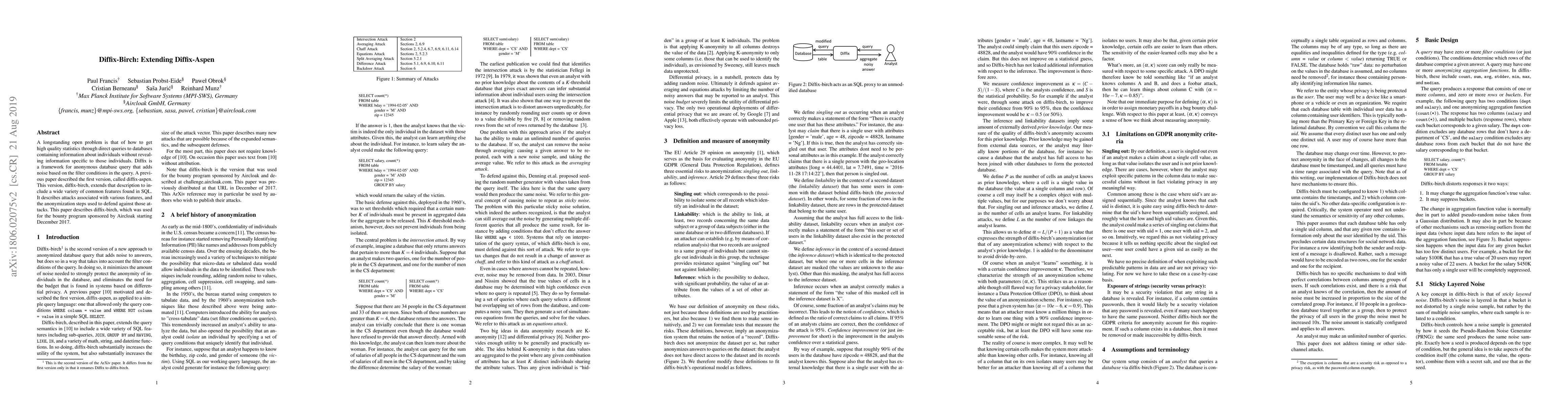 Diffix-Birch extends Diffix-Aspen to support common SQL features while defending against attacks on individual data privacy. It provides anonymization steps to ensure high-quality statistics without revealing sensitive information.