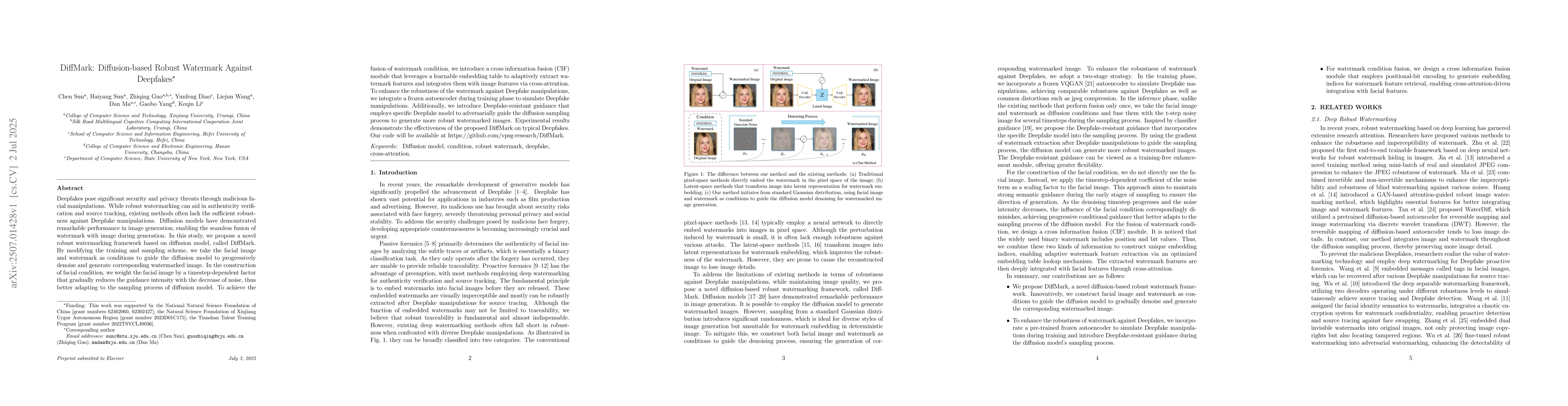 This research introduces DiffMark, a robust watermarking framework using diffusion models to counter deepfakes. DiffMark integrates a watermark into facial images by adapting guidance intensity and employing a cross information fusion module. It also includes a frozen autoencoder for simulating deepfake manipulations and deepfake-resistant guidance for enhanced robustness. Experiments show its effectiveness against typical deepfakes.
