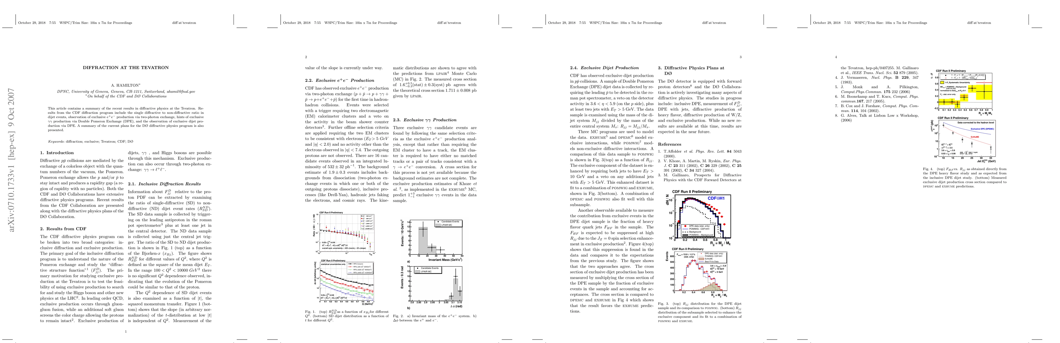 This article contains a summary of the recent results in diffractive physics at the Tevatron. Results from the CDF diffraction program include the single diffractive to non-diffractive ratio in dijet events, observation of exclusive $e^+e^-$ production via two-photon exchange, hints of exclusive $\gamma\gamma$ production via Double Pomeron Exchange (DPE), and the observation of exclusive dijet production via DPE. A summary of the current plans for the D\O\ diffractive physics program is also presented.