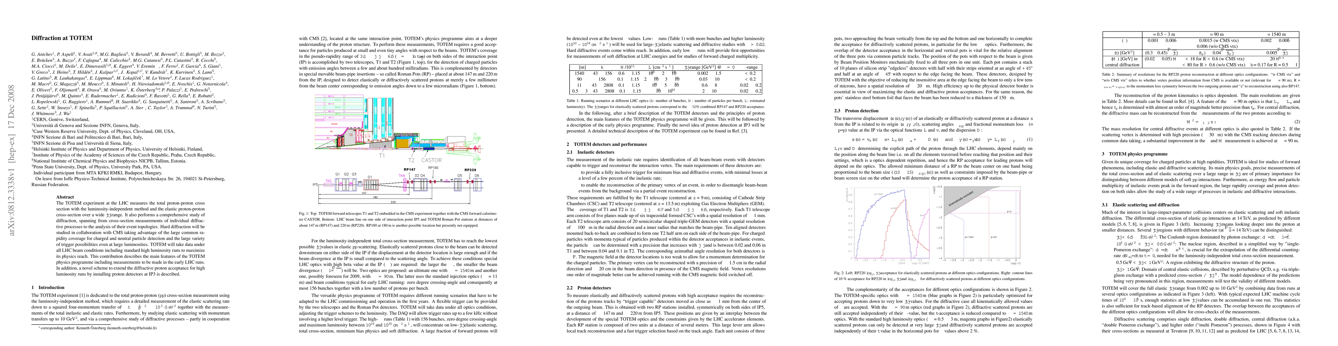 The TOTEM experiment at the LHC measures total and elastic proton-proton cross sections and studies diffraction processes, collaborating with CMS for hard diffraction. A novel scheme to enhance proton acceptance for high luminosity runs is proposed.