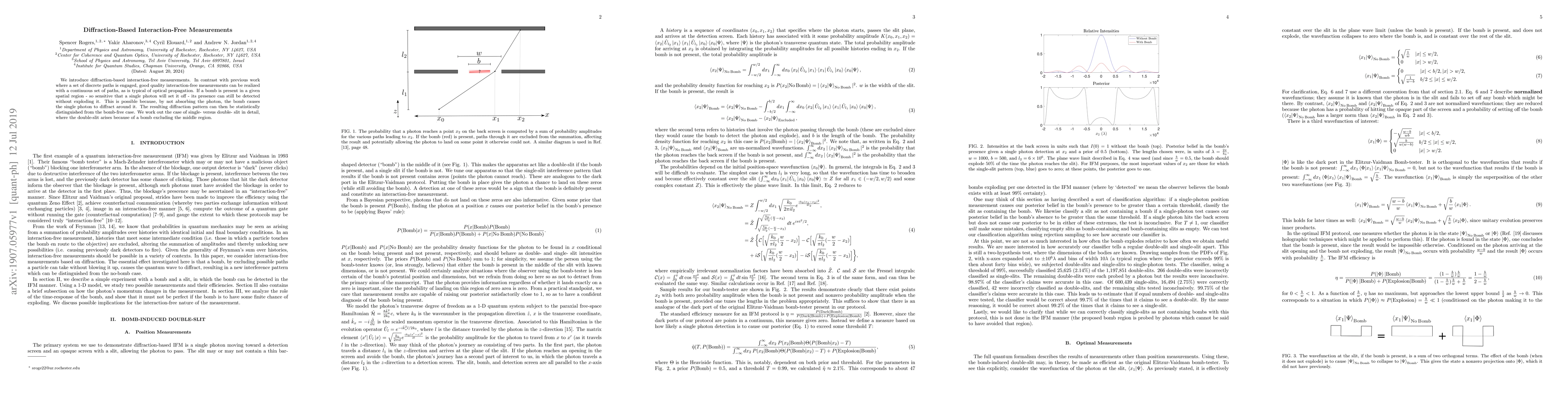 We introduce diffraction-based interaction-free measurements. In contrast with previous work where a set of discrete paths is engaged, good quality interaction-free measurements can be realized with a continuous set of paths, as is typical of optical propagation. If a bomb is present in a given spatial region -- so sensitive that a single photon will set it off -- its presence can still be detected without exploding it. This is possible because, by not absorbing the photon, the bomb causes the single photon to diffract around it. The resulting diffraction pattern can then be statistically distinguished from the bomb-free case. We work out the case of single- versus double- slit in detail, where the double-slit arises because of a bomb excluding the middle region.