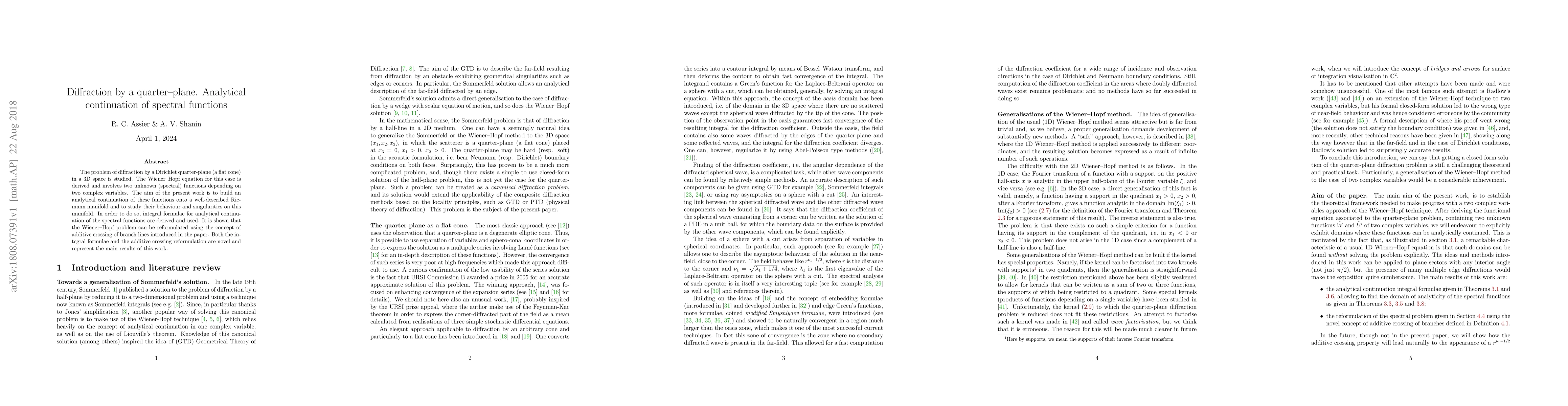 This paper studies diffraction by a Dirichlet quarter-plane in 3D space, deriving a Wiener-Hopf equation with two complex spectral functions. The main contribution is the analytical continuation of these functions onto a Riemann manifold and the introduction of novel integral formulae and additive crossing concepts for reformulating the Wiener-Hopf problem.