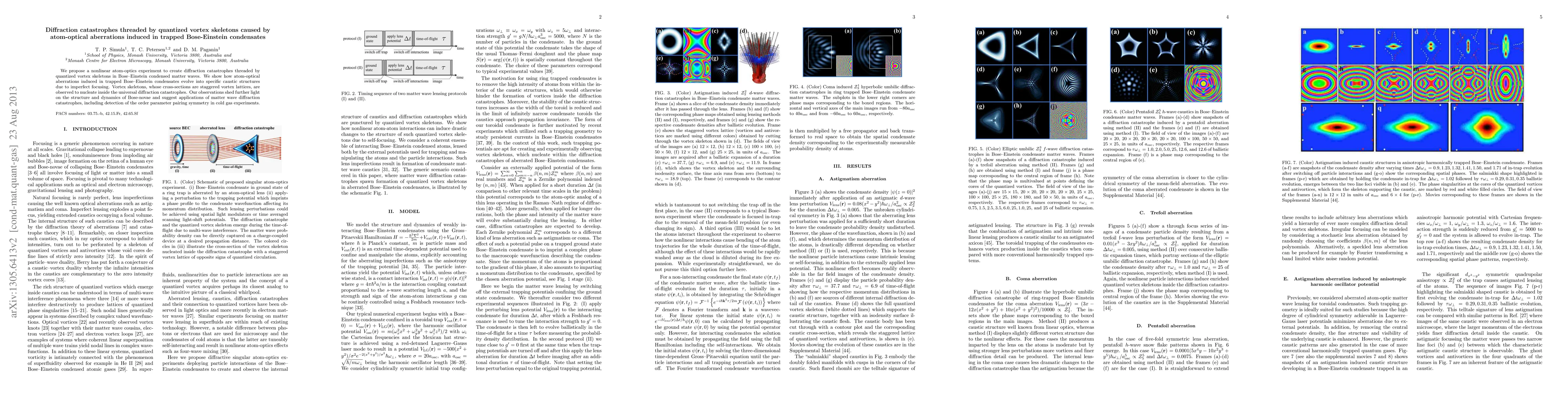 This paper proposes an atom-optics experiment to create diffraction catastrophes in Bose-Einstein condensates, revealing quantized vortex skeletons due to atom-optical aberrations. The study highlights the formation of staggered vortex lattices and suggests potential applications in detecting order parameter pairing symmetry in cold gas experiments.
