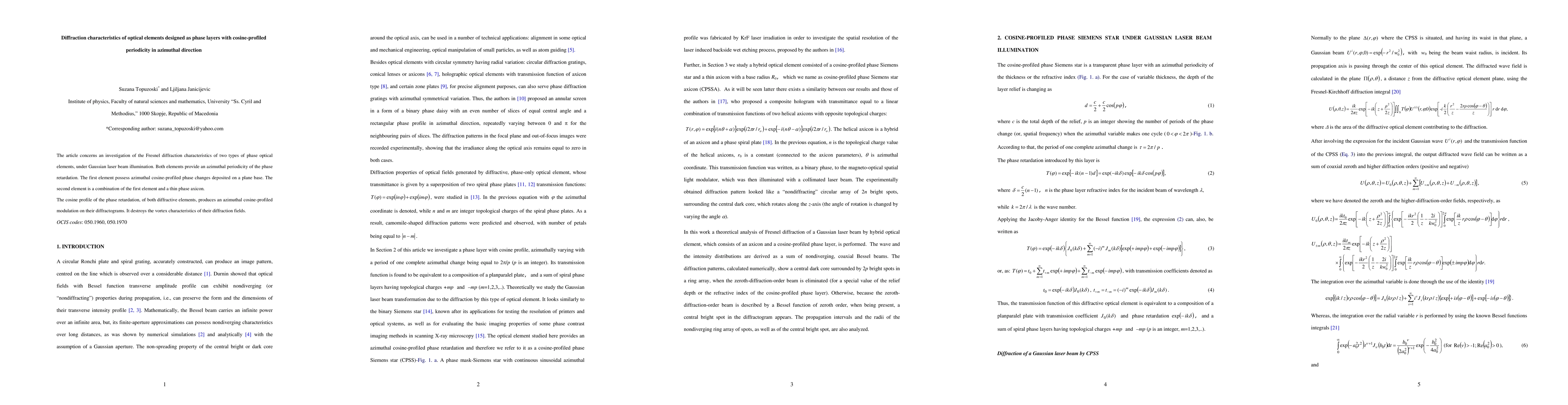 The article concerns an investigation of the Fresnel diffraction characteristics of two types of phase optical elements, under Gaussian laser beam illumination. Both elements provide an azimuthal periodicity of the phase retardation. The first element possess azimuthal cosine-profiled phase changes deposited on a plane base. The second element is a combination of the first element and a thin phase axicon. The cosine profile of the phase retardation, of both diffractive elements, produces an azimuthal cosine-profiled modulation on their diffractograms. It destroys the vortex characteristics of their diffraction fields.