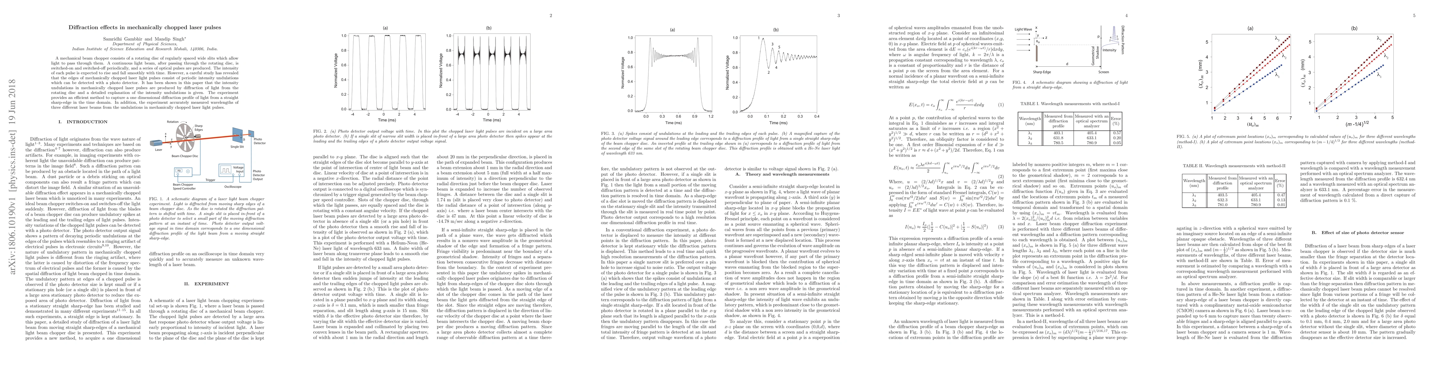 A mechanical beam chopper consists of a rotating disc of regularly spaced wide slits which allow light to pass through them. A continuous light beam, after passing through the rotating disc, is switched-on and switched-off periodically, and a series of optical pulses are produced. The intensity of each pulse is expected to rise and fall smoothly with time. However, a careful study has revealed that the edges of mechanically chopped laser light pulses consist of periodic intensity undulations which can be detected with a photo detector. It has been shown in this paper that the intensity undulations in mechanically chopped laser pulses are produced by diffraction of light from the rotating disc and a detailed explanation of the intensity undulations is given. The experiment provides an efficient method to capture a one dimensional diffraction profile of light from a straight sharp-edge in the time domain. In addition, the experiment accurately measured wavelengths of three different laser beams from the undulations in mechanically chopped laser light pulses.
