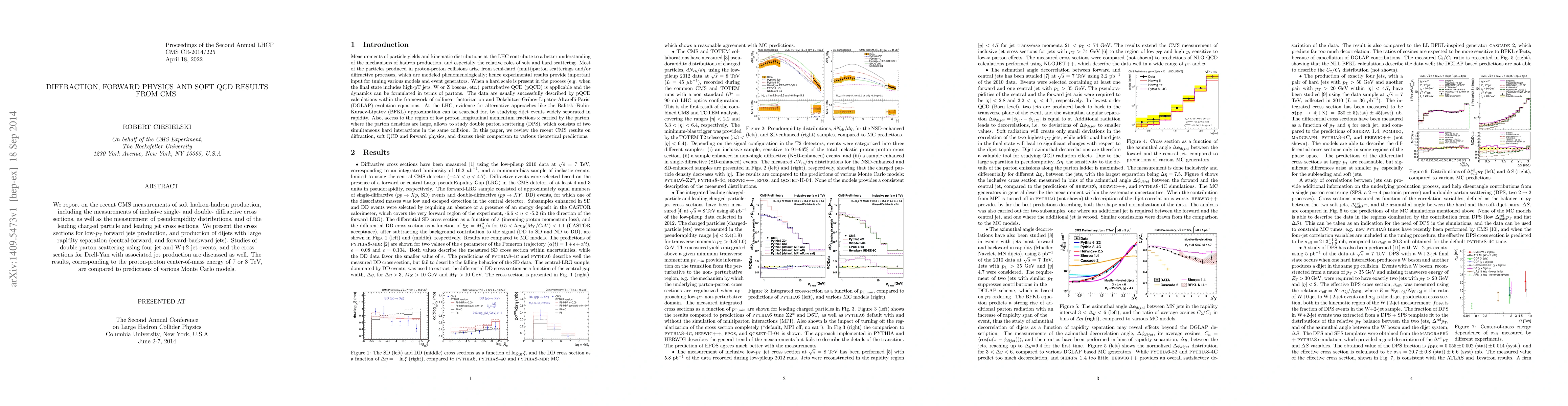 We report on the recent CMS measurements of soft hadron-hadron production, including the measurements of inclusive single- and double-diffractive cross sections, as well as the measurement of pseudorapidity distributions, and of the leading charged particle and leading jet cross sections. We present the cross sections for low-pT forward jets production, and production of dijets with large rapidity separation (central-forward, and forward-backward jets). Studies of double parton scattering using four-jet and W+2-jet events, and the cross sections for Drell-Yan with associated jet production are discussed as well. The results, corresponding to the proton-proton center-of-mass energy of 7 or 8 TeV, are compared to predictions of various Monte Carlo models.