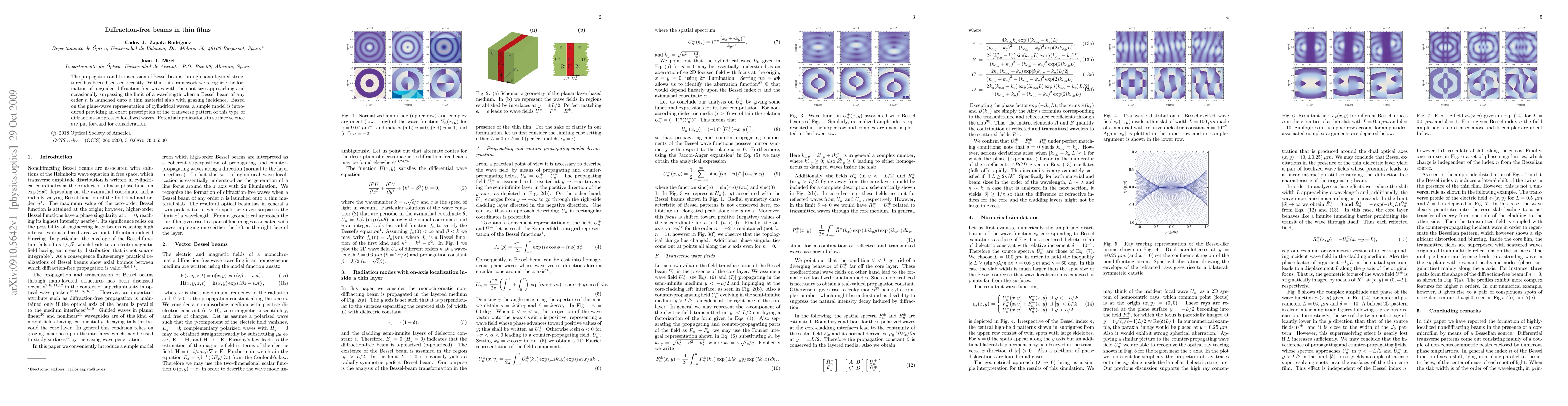The propagation and transmission of Bessel beams through nano-layered structures has been discussed recently. Within this framework we recognize the formation of unguided diffraction-free waves with the spot size approaching and occasionally surpassing the limit of a wavelength when a Bessel beam of any order n is launched onto a thin material slab with grazing incidence. Based on the plane-wave representation of cylindrical waves, a simple model is introduced providing an exact prescription of the transverse pattern of this type of diffraction-suppressed localized waves. Potential applications in surface science are put forward for consideration.