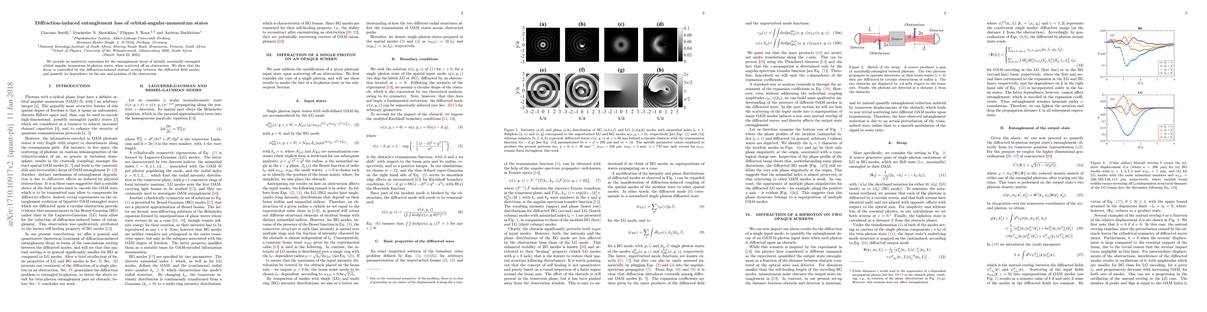 Researchers developed an analytical expression for entanglement loss in orbital angular momentum bi-photon states when scattered off an obstruction, showing that diffraction controls the decay and quantifying its dependence on the obstruction's size and position.
