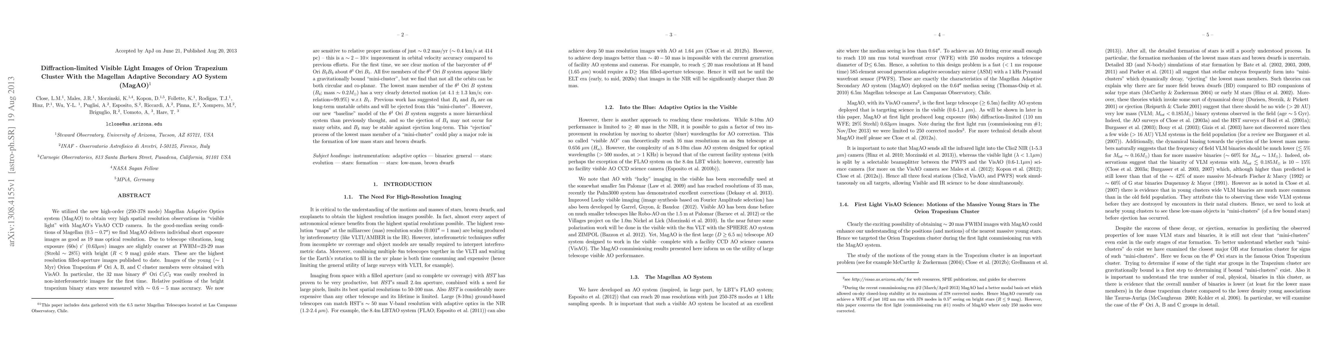 This study utilizes the Magellan Adaptive Optics system (MagAO) to achieve diffraction-limited visible light images of the Orion Trapezium cluster, resolving individual stars and binary systems with unprecedented precision. The findings suggest significant improvements in the accuracy of relative proper motions and hint at the ejection dynamics of the lowest mass member in the Theta 1 Ori B system, potentially influencing the formation of low-mass stars and brown dwarfs.