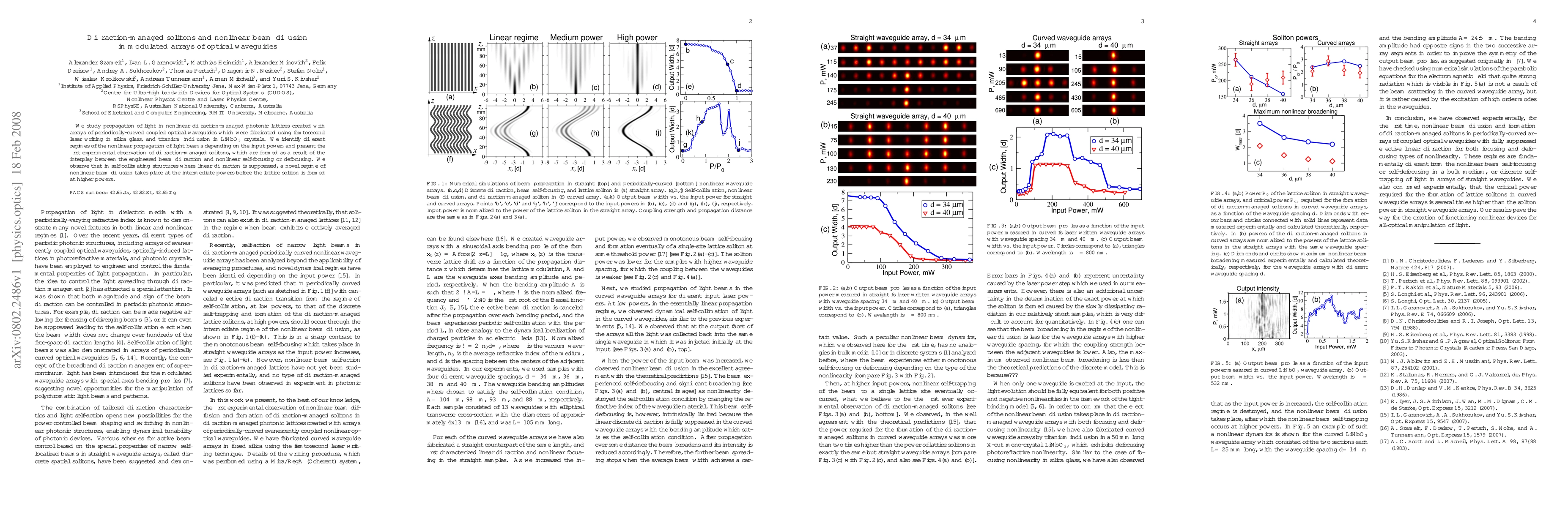 This paper investigates the propagation of light in engineered photonic lattices using arrays of curved optical waveguides, revealing distinct regimes of nonlinear beam behavior. The study reports the first experimental observation of diffraction-managed solitons and the emergence of nonlinear beam diffusion at intermediate powers before soliton formation at higher powers.